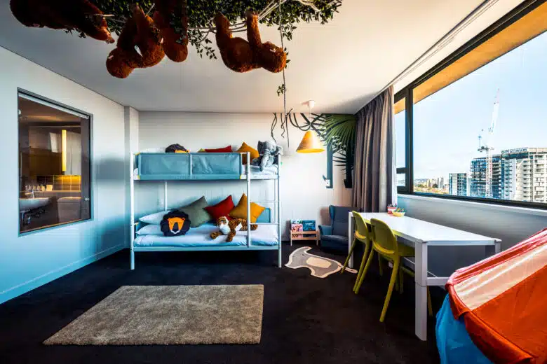 房間內的設計風格典型,是一般商務酒店的標準。除了風景之外,其親子睡房都充滿特色。房間內設置了一家兒童睡房,以森林為主題,而且配有不同的玩具,營造出溫馨愉悅的氛圍,讓家庭入住時能夠享受和諧的時光。