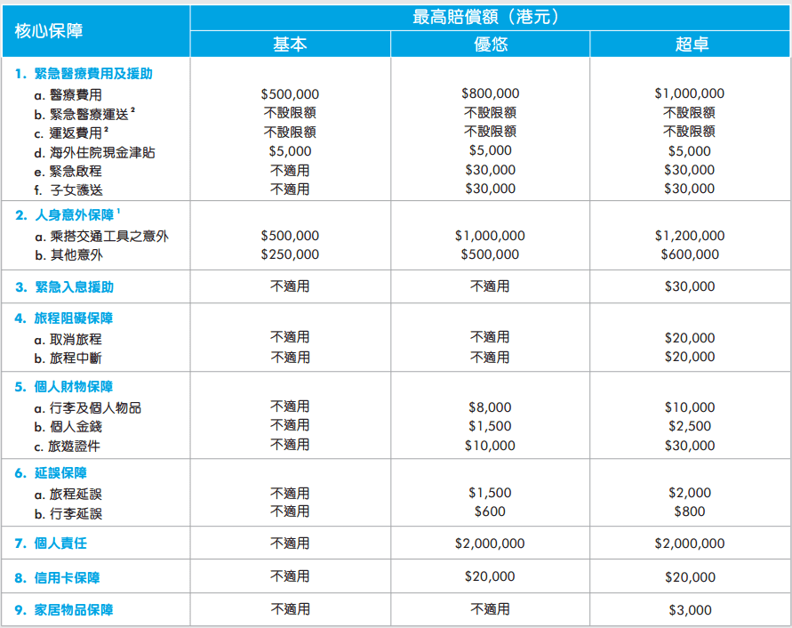 - 提供低至五小時旅程延誤保障取消旅程及旅程阻礙保障