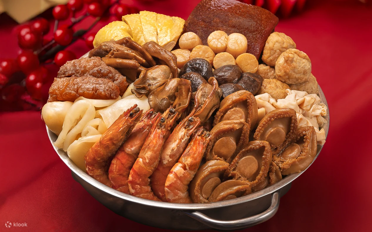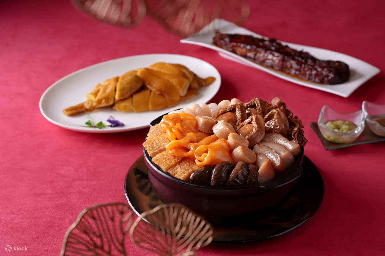 九龍海逸君綽酒店中菜廳海雲天於新春期間推出 18 道風味極品鮑魚佛跳牆盆菜(6 位用),定價 HK$1,488,採用外賣自取方式。盆菜共 18 款食材,包括 6 頭富貴鮑魚(6 隻)、原件花膠、北海道乾瑤柱、茄汁大蝦、貴妃雞、原條釀鯪魚、鮑汁鵝掌、南乳豬手、紅燒花菇、客家腩仔、長洲大魚蛋、腐皮福袋、五香芋頭、畔塘蓮藕及清甜蘿蔔等,層次豐富,走經典佛跳牆路線。顧客可於 14:00–16:30 到 九龍紅磡德豐街 20 號海逸君綽酒店二樓領取;如需送貨,可自行安排 GOGOVAN 或 LALAMOVE,運費需到付。
