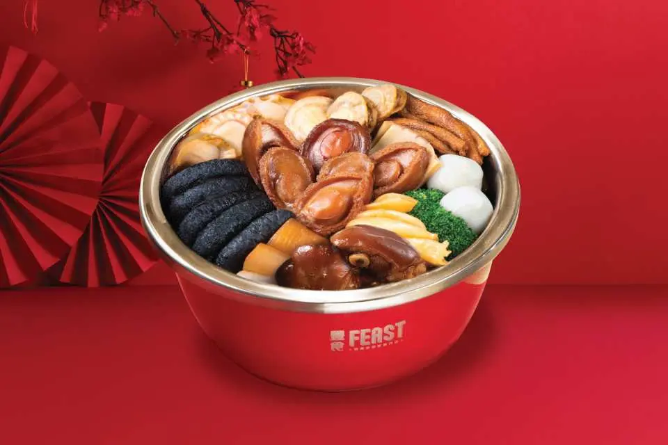 FEAST 於新春期間推出鮑魚珍饈豐食盆菜及珍饌團圓盆菜套餐,提供免費直送上門服務,並設有早鳥優惠低至 87 折,適合 4–6 人家庭聚餐。當中,鮑魚珍饈豐食盆菜(4–6 人份)早鳥優惠價 HK$838(原價 HK$958),包含溏心鮑魚、原條海參、鮮元貝、鮑汁燴花膠、鮑汁鴨掌、蠔皇螺片、鮑汁豬手、秘醬炆豬皮、帶骨雞腿肉、白魚蛋、杏鮑菇、板栗、醬香蘿蔔及上湯西蘭花等 14 款食材,並額外敬送新鮮娃娃菜及烏冬,採用真空冷凍配送,加熱即可享用,隨盆附送 6 份環保餐具套裝。另有珍饌團圓盆菜套餐(4–6 人份),早鳥優惠價 HK$1,350(原價 HK$1,552),除上述盆菜外,還包括一隻約 1.5 公斤的原隻薑蔥霸王雞,以及一份約 2 磅的煙三文魚七彩撈起,菜式組合更完整,節慶氣氛十足。盆菜送貨時段為 9:00–18:00,而套餐送貨時段則為 11:00–13:00 或 17:00–19:00,整體屬方便、省心又具性價比的新春直送之選。