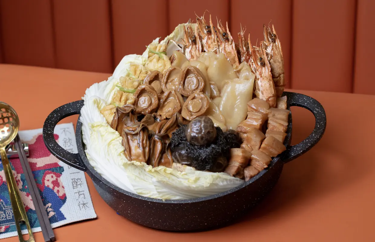 卅二公館 Mott 32 今年亦推出多款節日限定盆菜選擇,主打高級食材與傳統風味結合,並採用中環自取方式。佛跳牆盆菜(建議 6 位享用)定價 HK$2,680,選用澳洲鮑魚、北海道元貝、日本海參及花膠等矜貴食材入饟,再配搭傳統盆菜元素,層次豐富,滋味濃厚,展現經典佛跳牆嘅奢華風味。發財大利圍村盆菜(建議 12 位享用)定價 HK$2,580,集合多款傳統圍村盆菜食材,包括走地雞、鯪魚球、花菇、炆豬肉、蘿蔔及枝竹,並加入瑤柱甫、豉油皇海中蝦及蠔豉等,份量十足,適合大家庭或親友聚會共享。