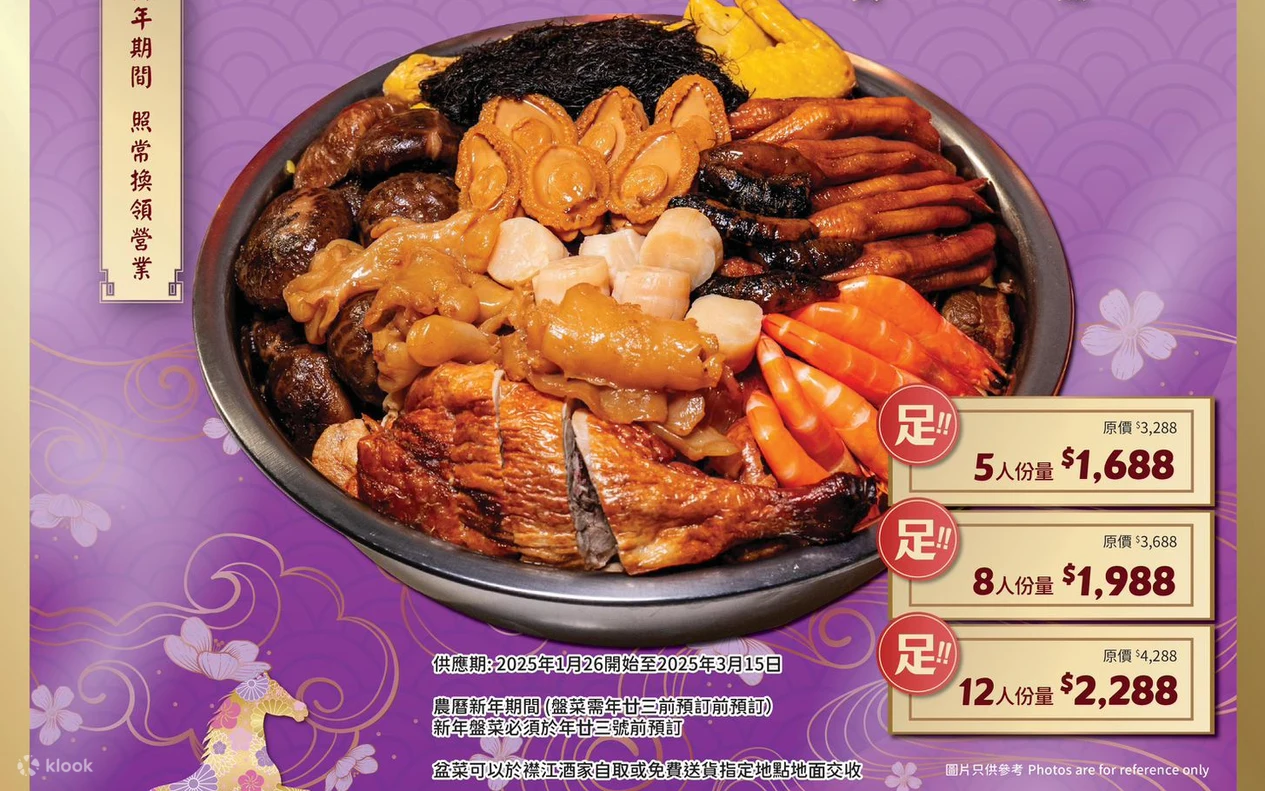 襟江酒家推出,盤滿缽滿賀年盆菜足 5 人份量 HK$1,388 發售(原價 HK$3,288),足 8 人份量 HK$1,688 (原價 HK$3,688),足 12 人份量 HK$1,988 (原價 HK$4,288),屬於折扣力度相當吸引嘅賀年盆菜之選。盆菜主打每日新鮮製造、100% 香港製造,不含防腐劑及味精,並以秘製古早醬汁烹調多款山珍海味,寓意來年豐收順利,滋味濃郁。優惠由即日起至 2026 年 3 月 15 日發售及適用,適合希望以相對親民價錢,享用傳統豪華盆菜風味嘅家庭或親友聚會。