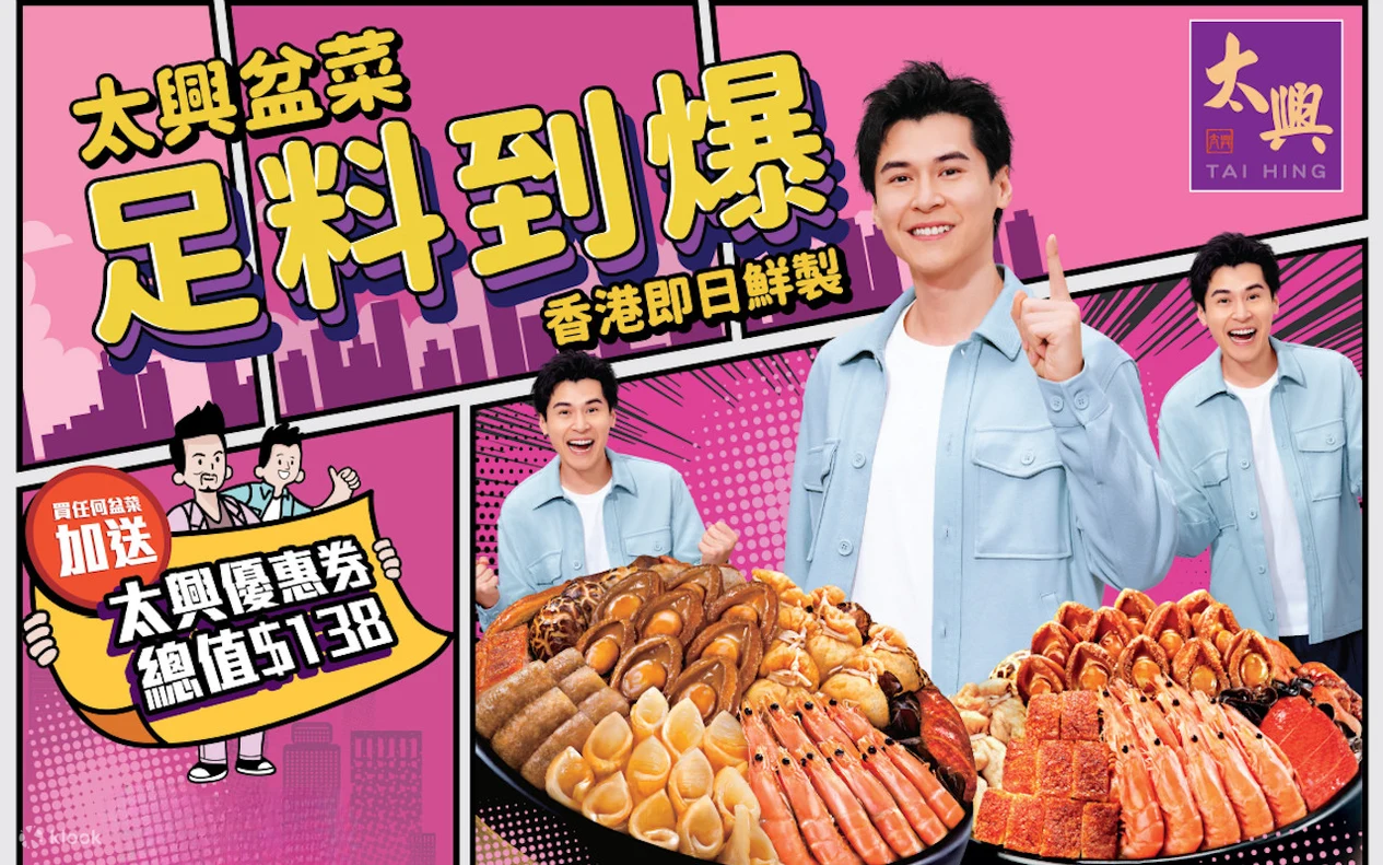 太興推出極品鮑參花膠至尊盆菜(8–10 位用)現正以優惠價 HK$1,900 發售(原價 HK$2,580),極品鮑魚開心大盆菜 (12 位用) 優惠價 HK$1,800 (原價 HK$ 2,480)。主打高性價比路線。盆菜合共 21 款珍品食材,包括原隻蠔皇鮑魚(8 隻)、紅炆花膠、蠔皇海參、瑤柱蠔豉福袋、大蝦、南乳豬手、秘製豬皮、紅炆花菇、5 星級燒肉、燒鵝及桶子油雞等,並配以原汁原味醬料,層次豐富,份量十足。優惠由即日起發售至 2026 年 2 月 27 日,適用日期至 2026 年 3 月 3 日,適合追求用料齊全又講求實惠嘅家庭團年選擇。