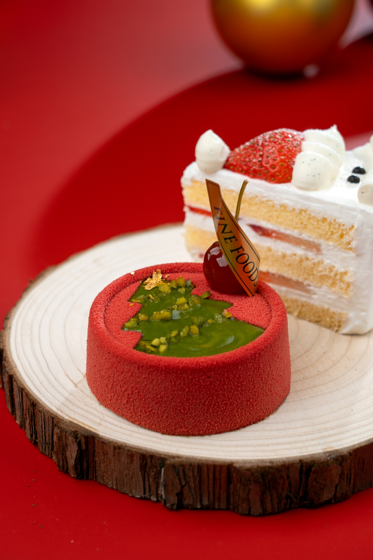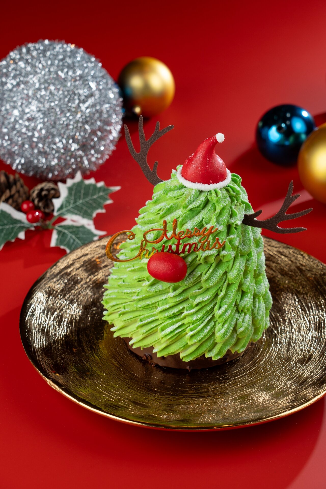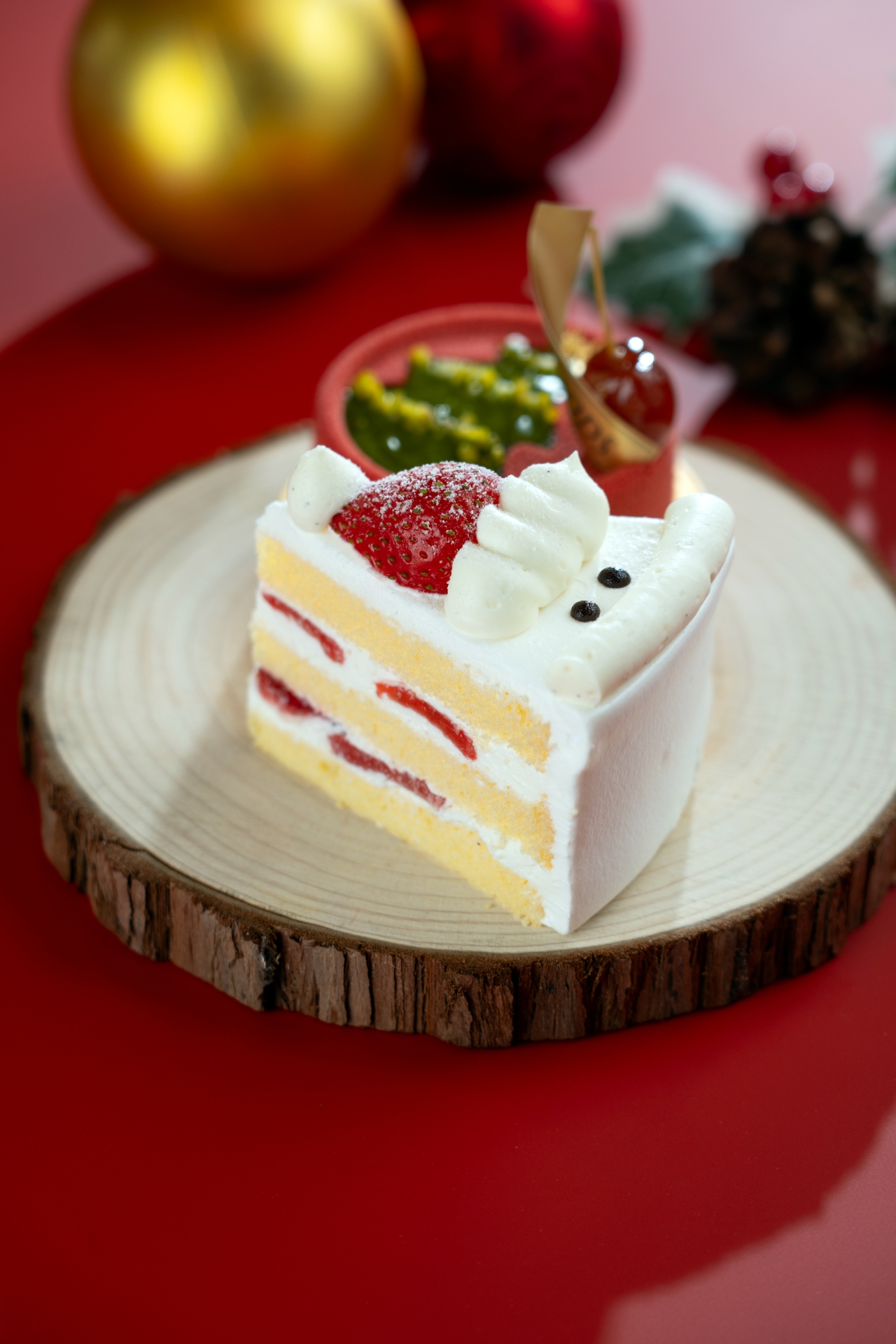 首先登場的,是今年最具視覺焦點的開心果朱古力蛋糕,香濃朱古力蛋糕為主體,面層以開心果忌廉細緻點綴,再加入來自杜拜的高級朱古力,令口感更見豐富。整個蛋糕以聖誕樹造型呈現,無論原個或件裝都是拍照打卡的節日甜品代表,打開即刻充滿節日氣息。熱情果牛奶朱古力蛋糕在榛子蛋糕裡加入香脆榛子粒,外層包裹柔滑牛奶朱古力慕絲,再搭配熱情果忌廉,讓整體味道甜中帶清,層次分明,是喜歡輕盈果香的你不能錯過的節慶之選。開心果控必試開心果車厘子蛋糕絕對會讓你一試愛上。蛋糕、脆脆、慕絲都以開心果為主調,再配上車厘子忌廉增添酸甜平衡,整體風味清新又富口感。喜歡經典口味的朋友,士多啤梨蛋糕依然是不敗之選。鬆軟海綿蛋糕配上香滑日本忌廉與新鮮士多啤梨,再加上可愛的聖誕老人造型,活現節日童趣,無論大人小朋友都會心一笑, 。