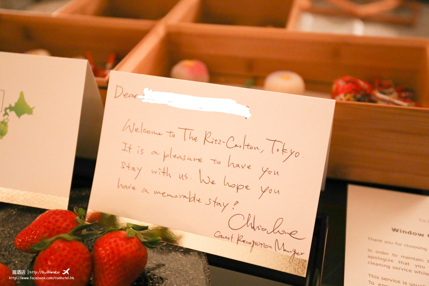現在就帶大家看看最窩心的地方,就是酒店為我們準備的迎賓卡、迎賓水果、精美的和果子和酒店自家製的朱古力,我們入房的時間,見到這些禮物真的感到非常驚喜,而 Ritz Carlton 的細心程度,亦真的令人讚歎!看似小小的幾塊普通朱古力和一些和果子,就分別用幾個木箱盛載,而且最貼心的地方,是每一樣食物前面,都會有寫明是什麼味道,例如這四塊朱古力都是不同味的,右上角印有 Ritz Carlton Logo 就是他們的招牌朱古力,沒想過可以這麼好味!
