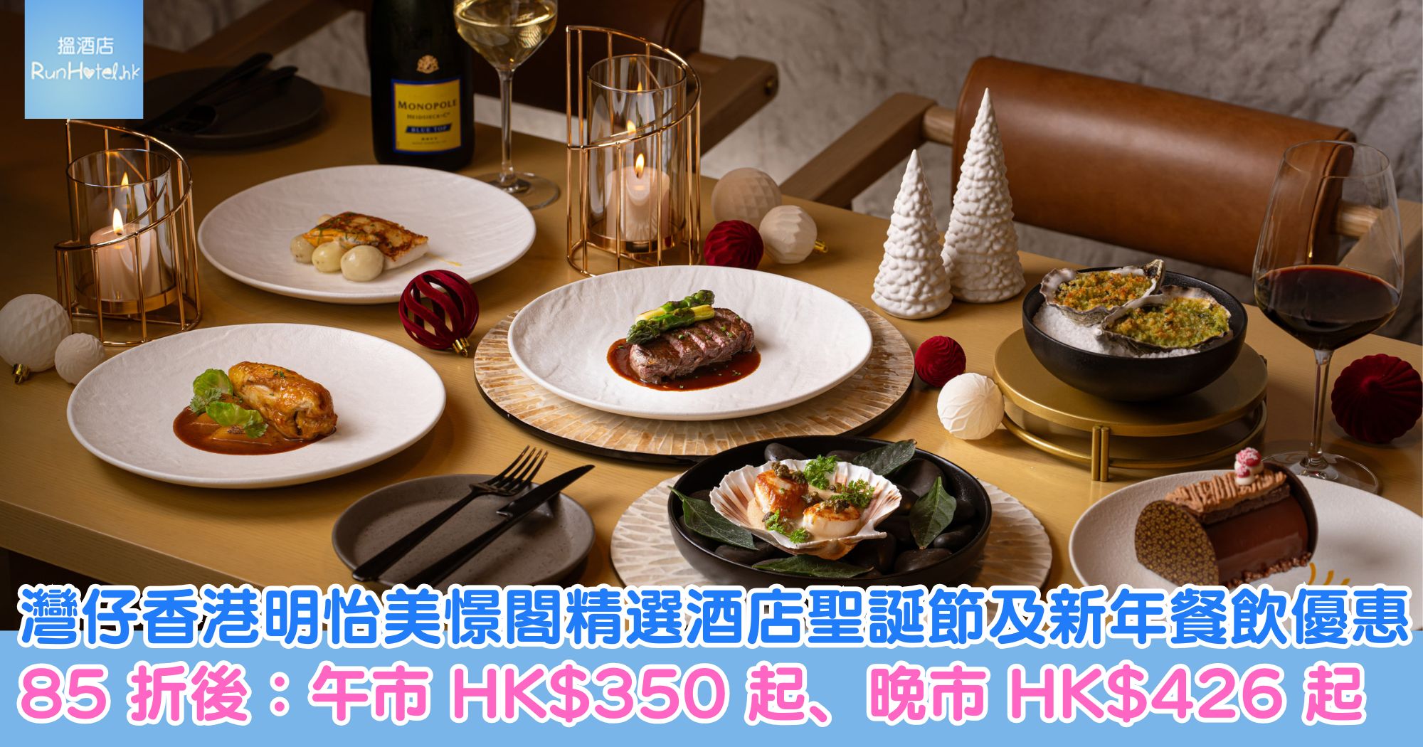 灣仔香港明怡美憬閣精選酒店 ( AKI Hotel Hong Kong) 二樓 TANGRAM Bistro & Bar 將於 12 月 24 至 26 日提供聖誕節套餐,並於 12 月 31 日及 2026 年 1 月 1 日供應新年套餐; 25 樓 Uncle Ming’s 威士忌酒吧同步於 12 月推出兩款熱雞尾酒。餐飲價格方面可享 85 折優惠,節慶午餐折後只需 HK$350 起、節慶晚餐折後只需 HK$426 起。