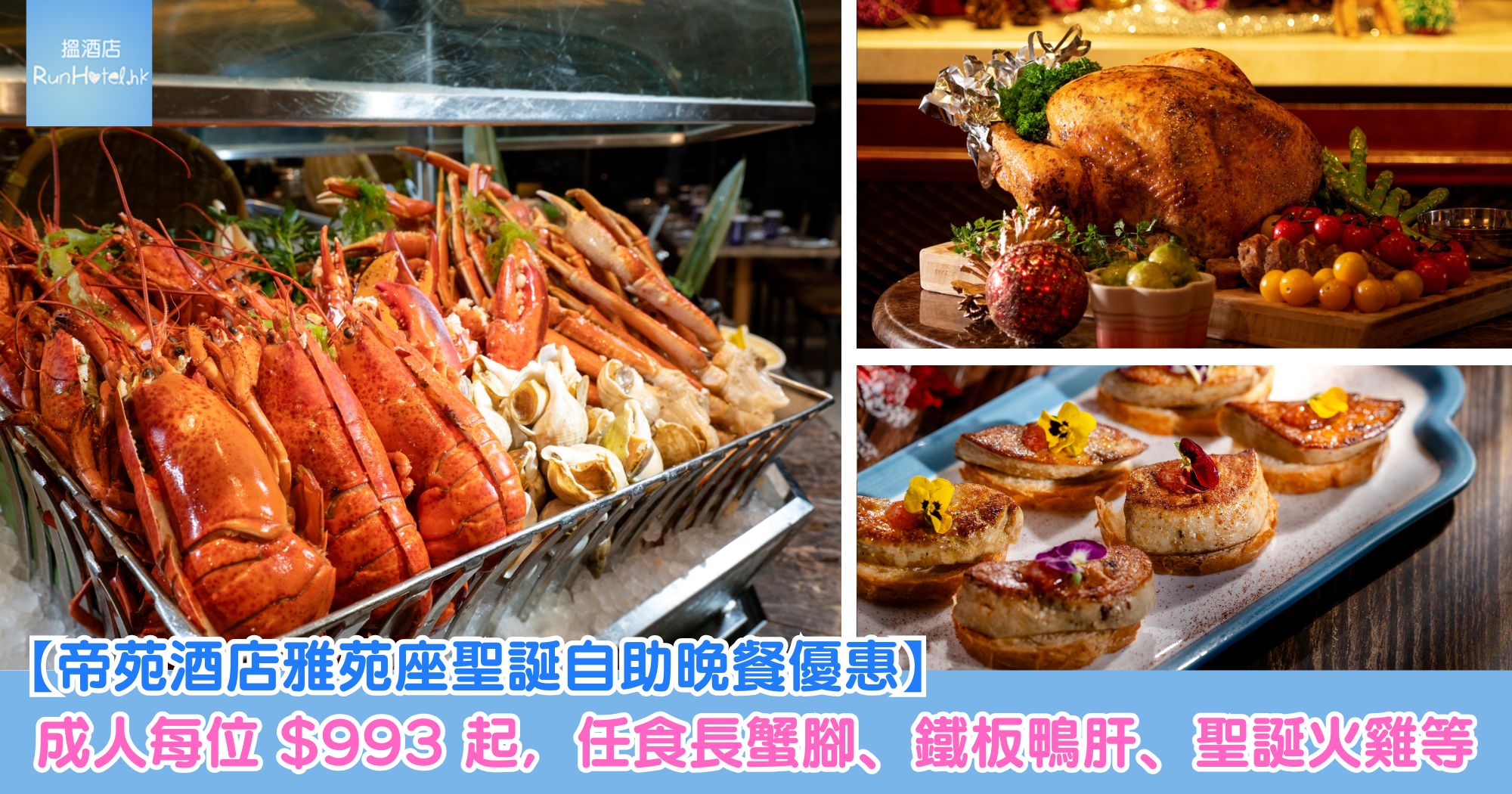 帝苑酒店三樓雅苑座宣布於 12 月 24 日、25 日、26 日、31 日及 1 月 1 日推出聖誕及新年自助晚餐,平安夜、聖誕日及除夕晚市設現場樂隊表演,並向每位客人敬送焗珍寶帶子米多配羊肚菌拼阿拉斯加蟹腳配香草牛油汁。成人每位由 HK$993 起,需預先購票及另收加一服務費。