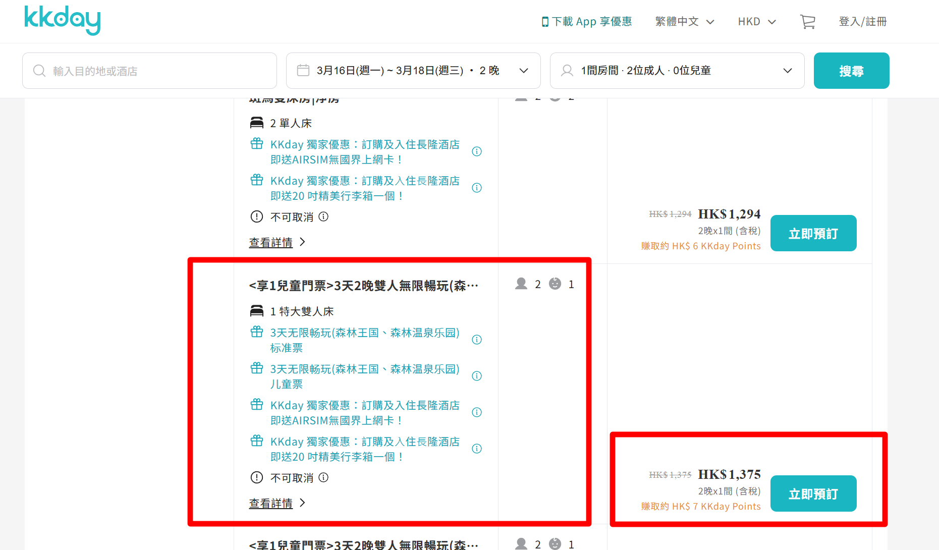 ▼ 查過系統,例如清遠長隆長頸鹿城堡酒店, 3 月 16 日入住,3 月 18 日退房,包門門票,Airasiam,行李箱,房價只需 HK$1,375