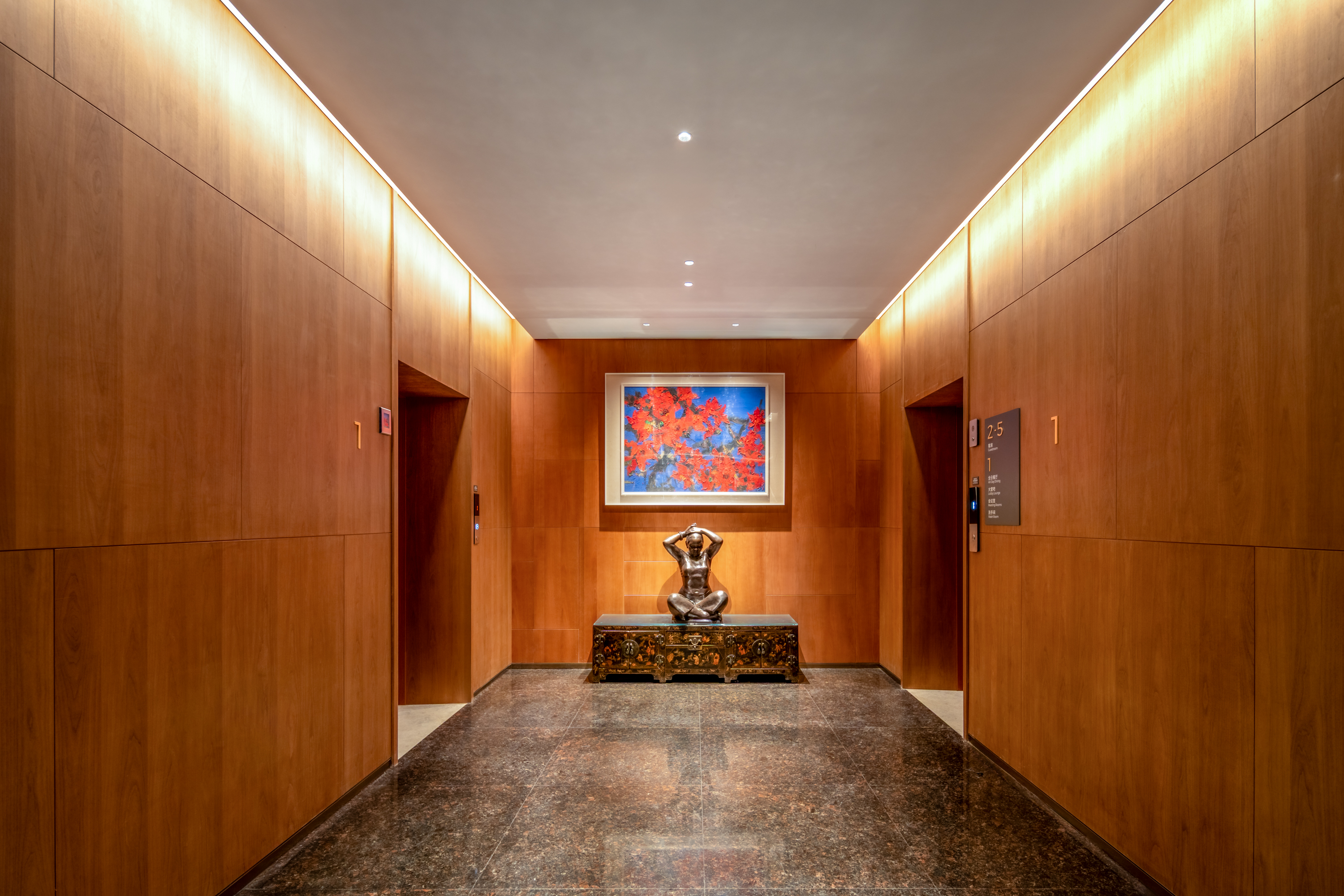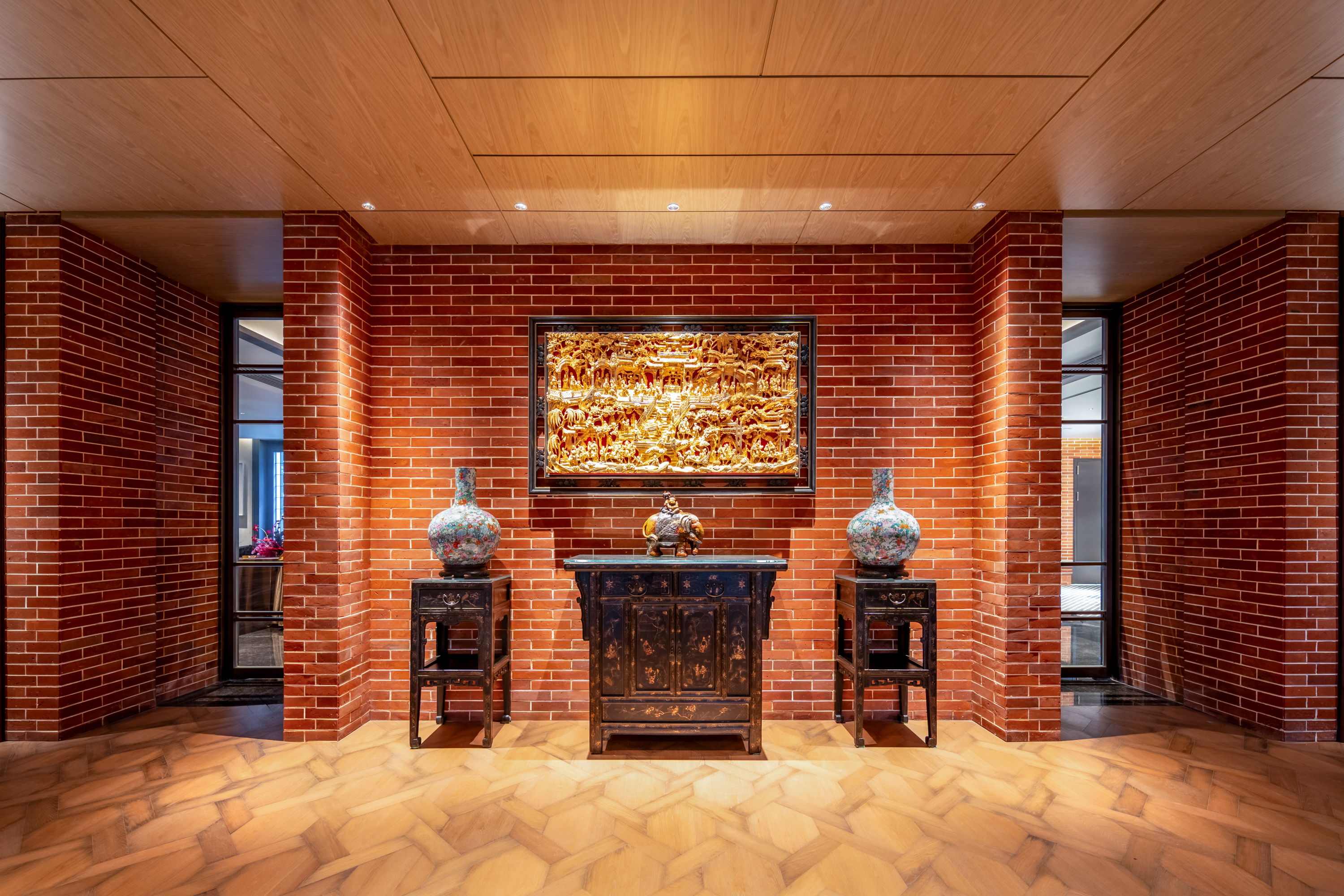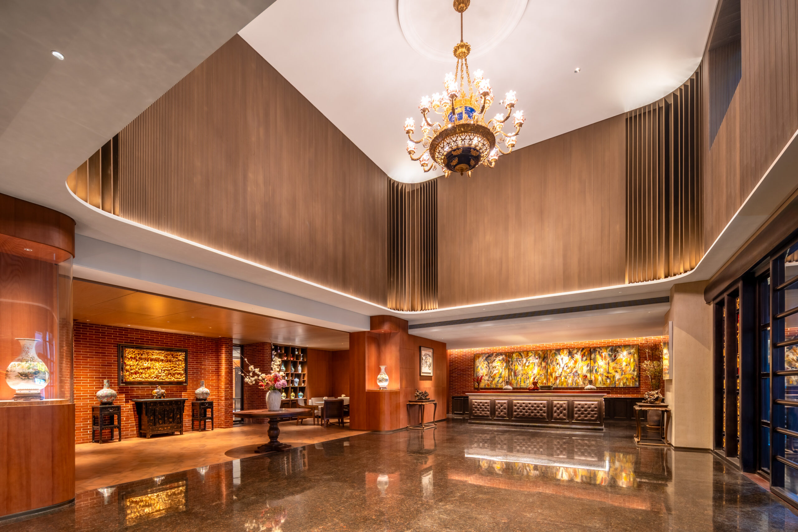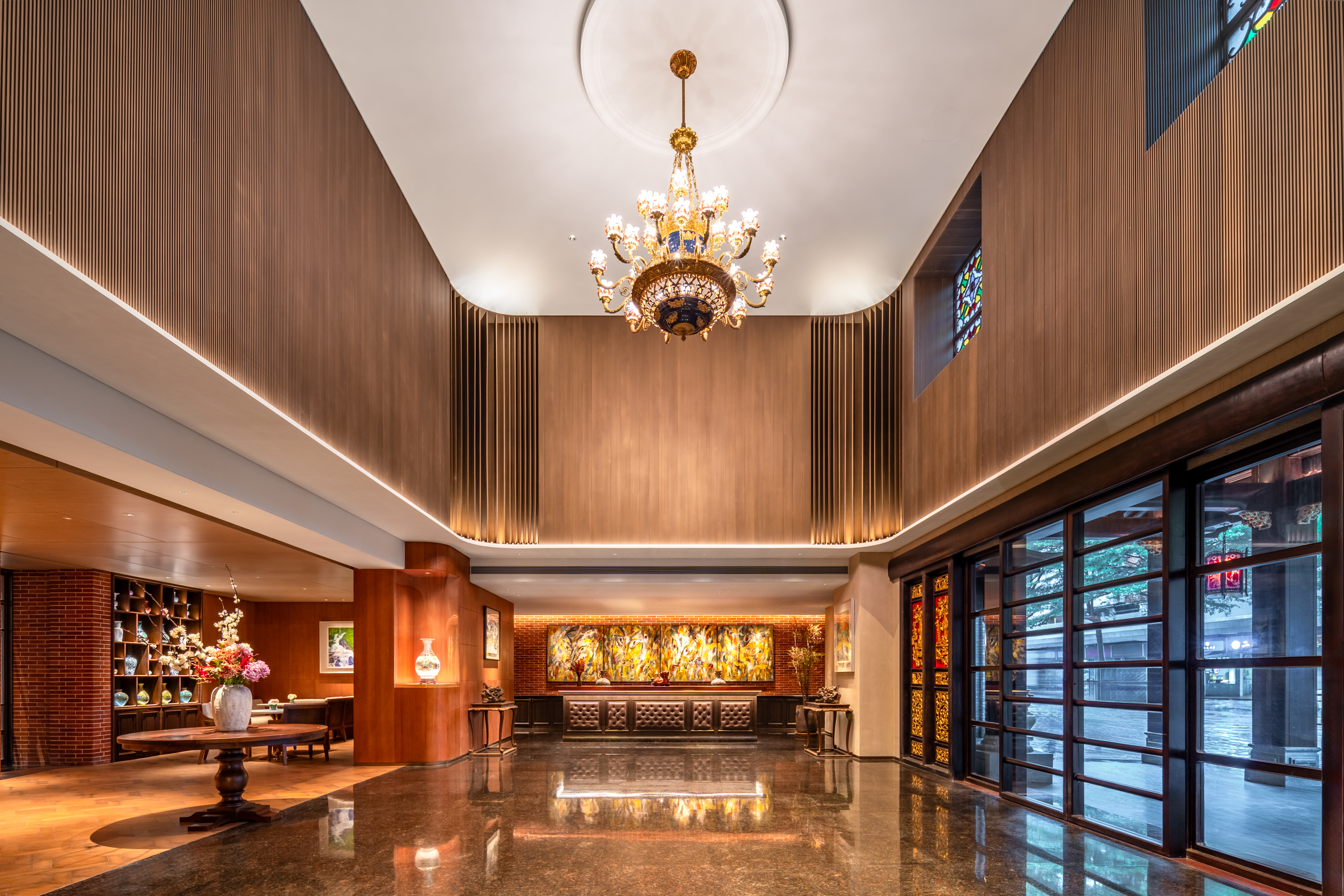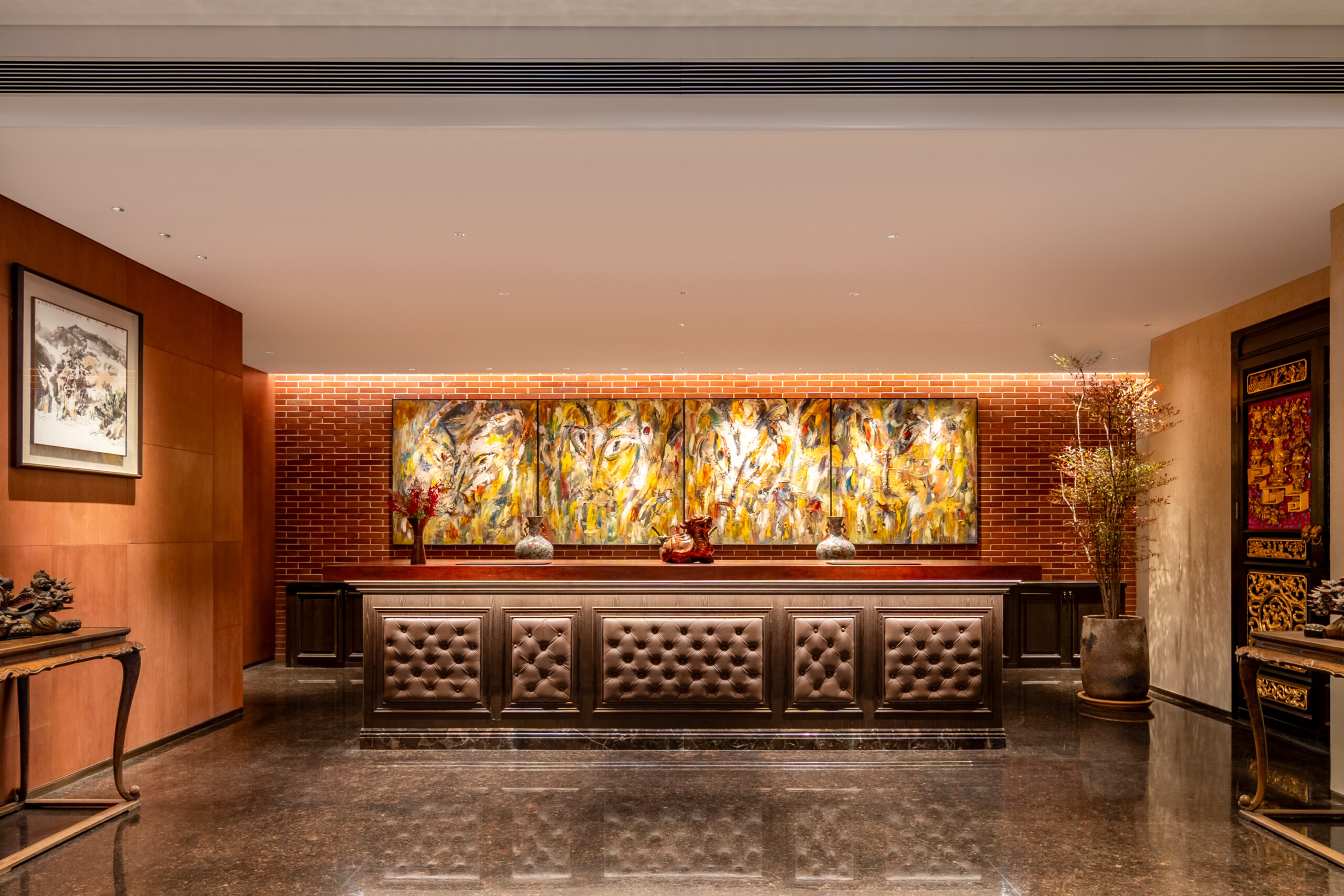▼ 整個入口用了深木色為主調,木樑、木柱都帶少量金色點綴,細緻但不浮誇,配合上方的大型金字招牌,氣派十足。左右兩側放了石獅子,增添少少古典味,好似步入一間有歷史背景的府邸。]感覺這間酒店在裝修上好用心,好明顯走傳統中式精品酒店路線。