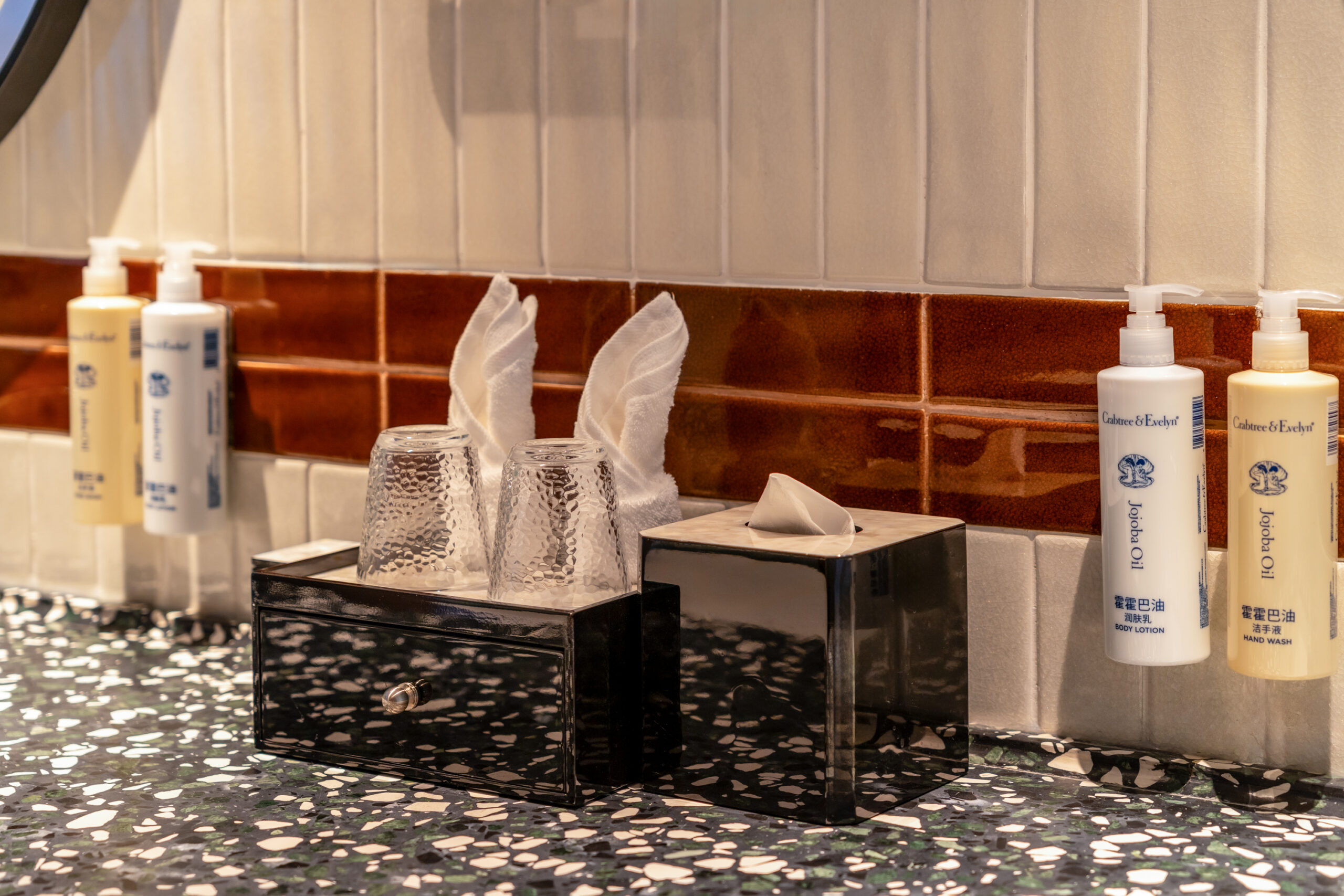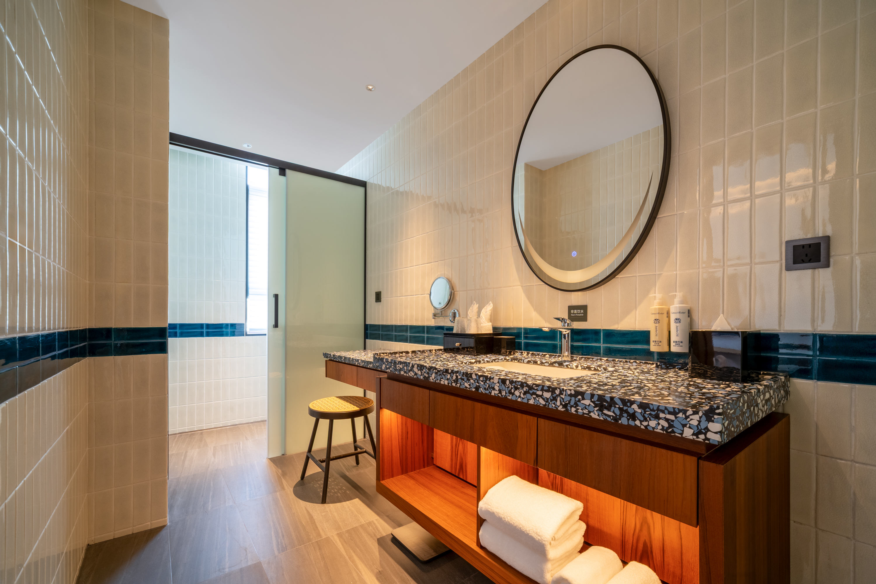 ▼ 浴室,空間比一般酒店大,好闊落。米白色長方形瓷磚配上一條藍綠色的橫向釉面磚,低調但有層次感。梳妝枱用咗碎石紋理的石面,好有精品酒店 feel,下面仲特別做咗開放式層架放毛巾。圓形大鏡加上柔光燈,成個感覺好舒服,影相、化妝打卡應該都好靚。旁邊仲有一張小凳,方便坐住吹頭、護膚,設計細心。