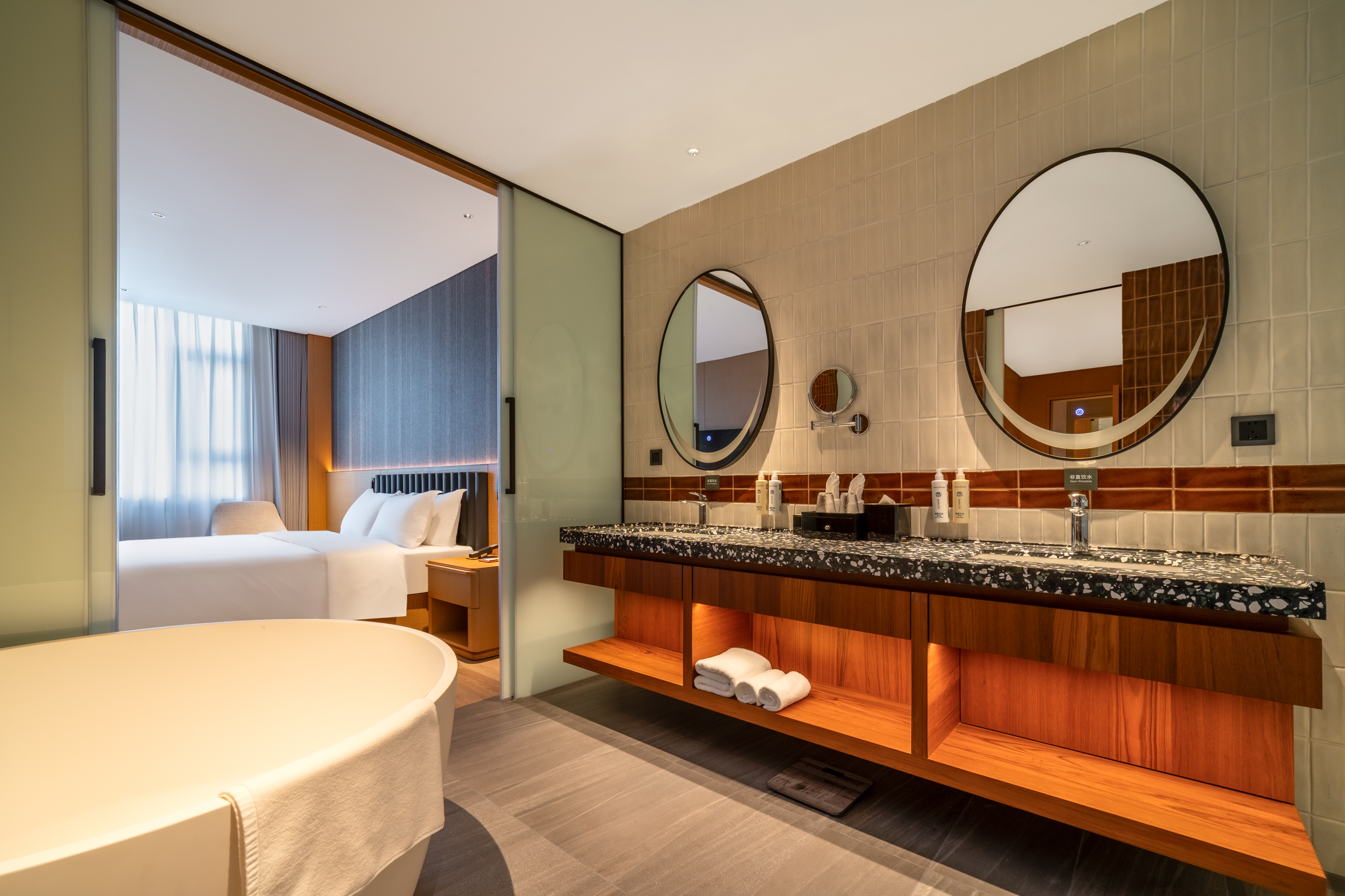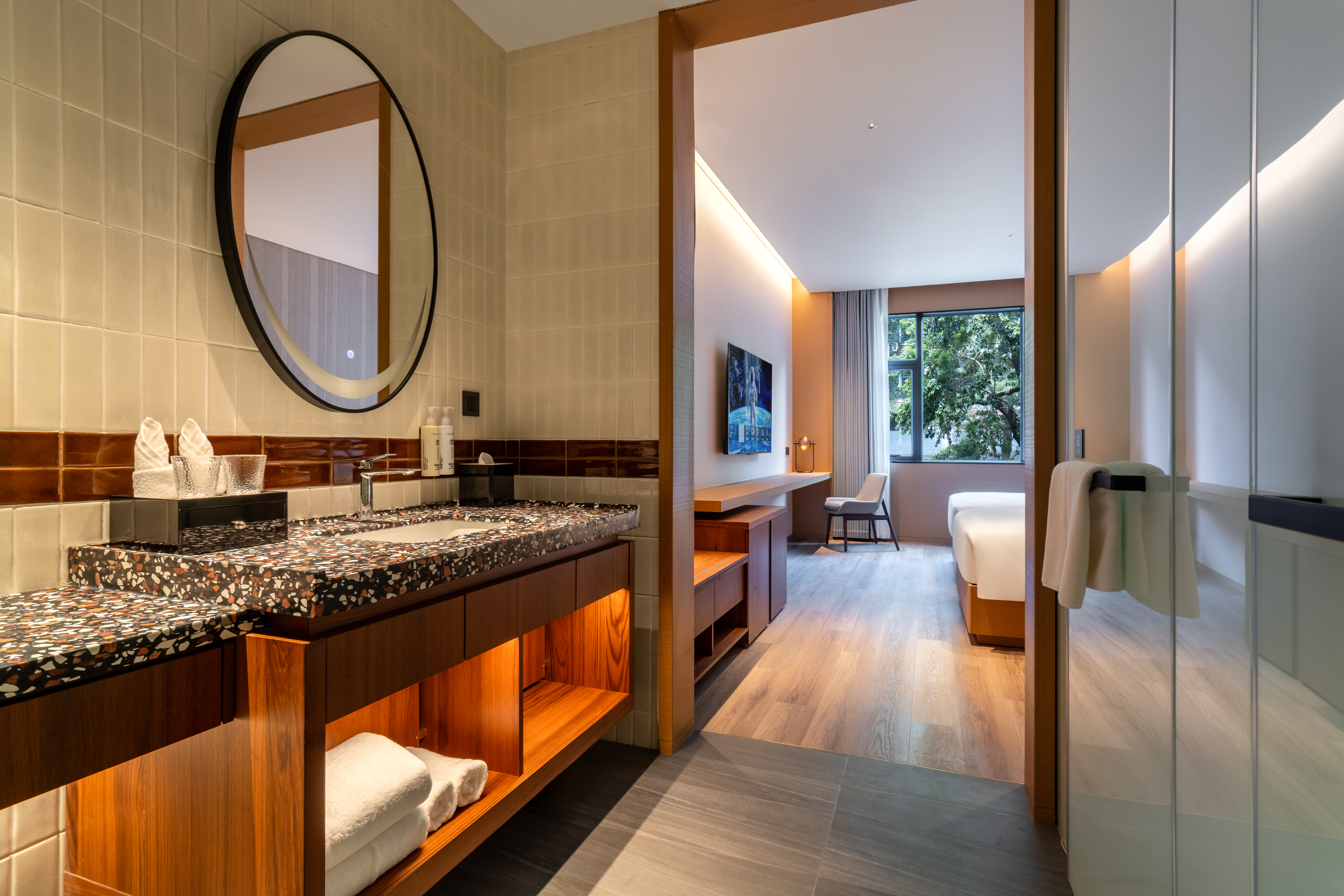 酒店共設 156 間客房,提供多種房型選擇,包括高級大床房、尊享大床房、尊貴花園景觀大床房、尊享雙床房,以及面積達 68-80 平方米的尊享大套房同尊貴花園景觀大套房。房間面積由 20 平方米至 80 平方米不等,所有客房均設有免費Wi-Fi、私人浴室、雪櫃及迷你吧。最貼心的是,迷你吧提供不同口味的免費飲品,包括咖啡、汽水等,住客可以隨時享用。房間裝修簡約豪華大氣,床品柔軟親膚,躺上去一夜好眠;衞生間採用乾濕分離設計,部分套房更配有浴缸。
