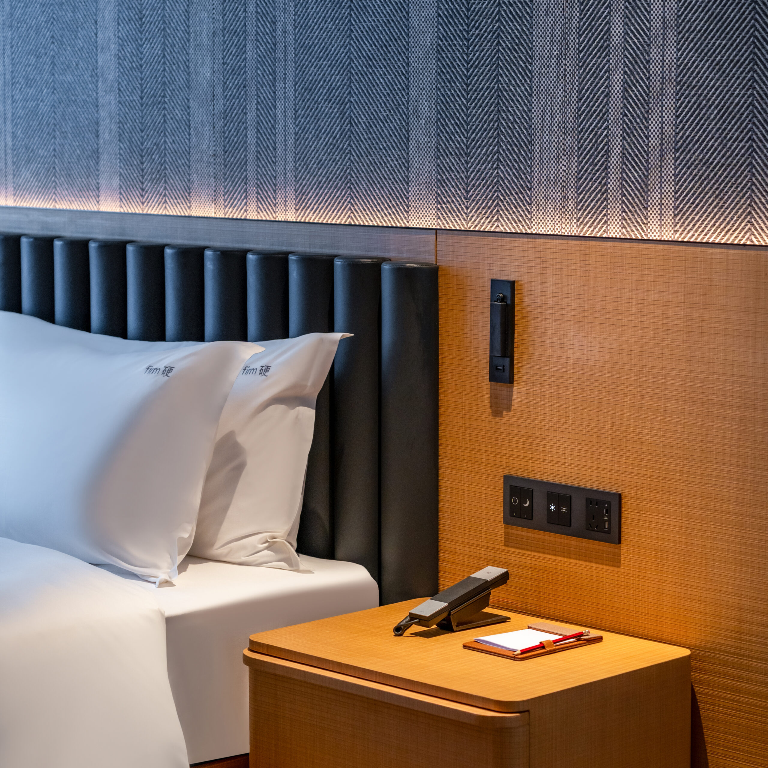 ▼床頭板用上深色皮革拼接,帶少少現代酒店 feel,而背後牆紙有細緻 herringbone(人字紋)質感,配上暖光燈帶,夜晚會幾有氣氛。枕頭上仲印有 “Firm” 字眼,代表枕頭軟硬度可選,住客可以揀自己喜歡的枕頭硬度,非常貼心。床頭櫃上擺放電話、筆記紙,插座同燈掣集中在旁邊,用落方便。