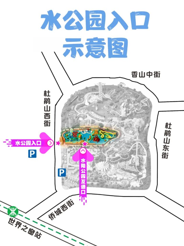 深圳瑪雅海灘水公園位於深圳地鐵 1 號線、2 號線世界之窗站, A 出口步行約 10 分鐘。