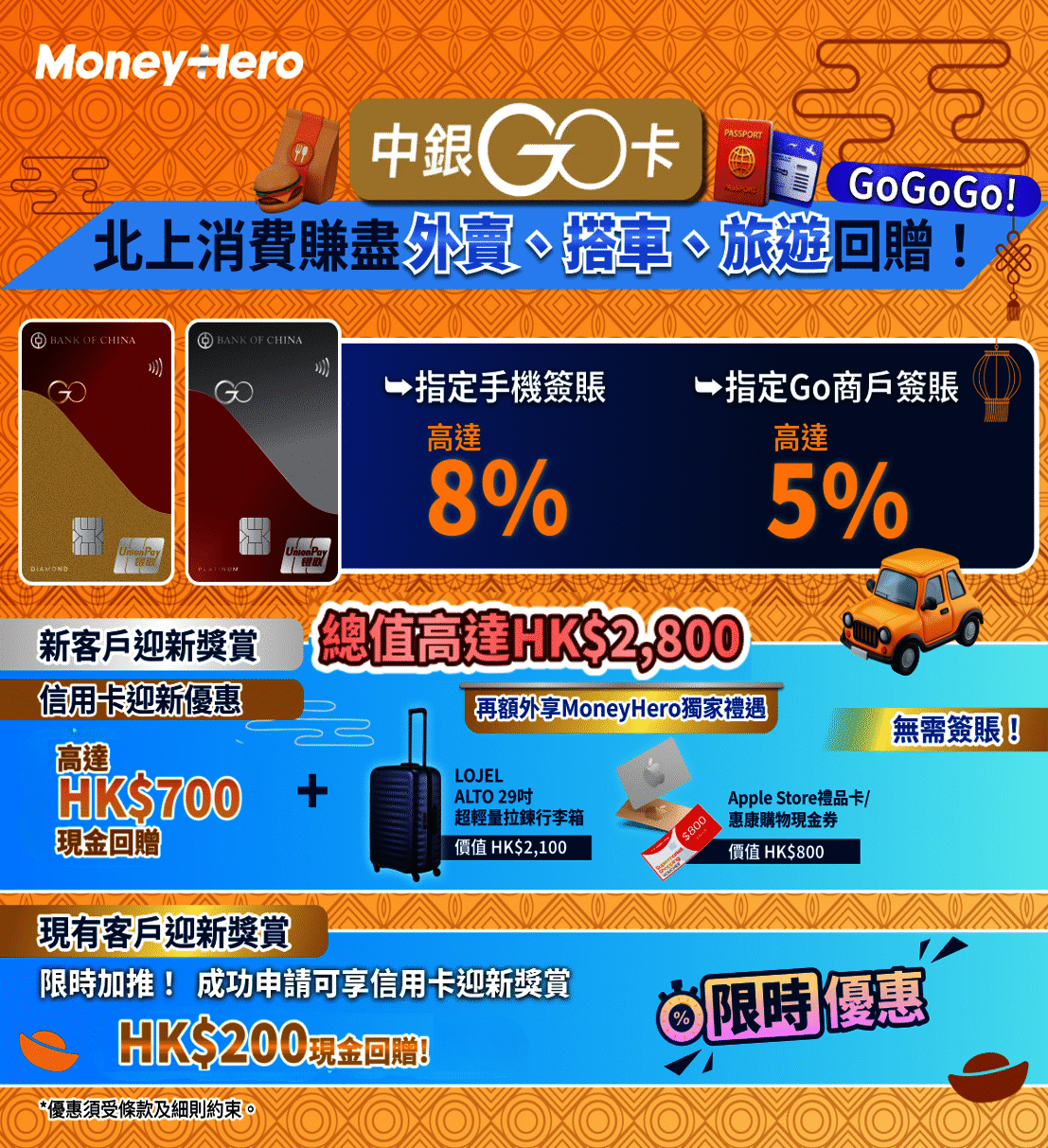 有關中銀 Go 卡及 MoneyHero 獨家迎新優惠詳情,可參閱以下官方連結: https://www.moneyhero.com.hk/zh/credit-card/provider/boc