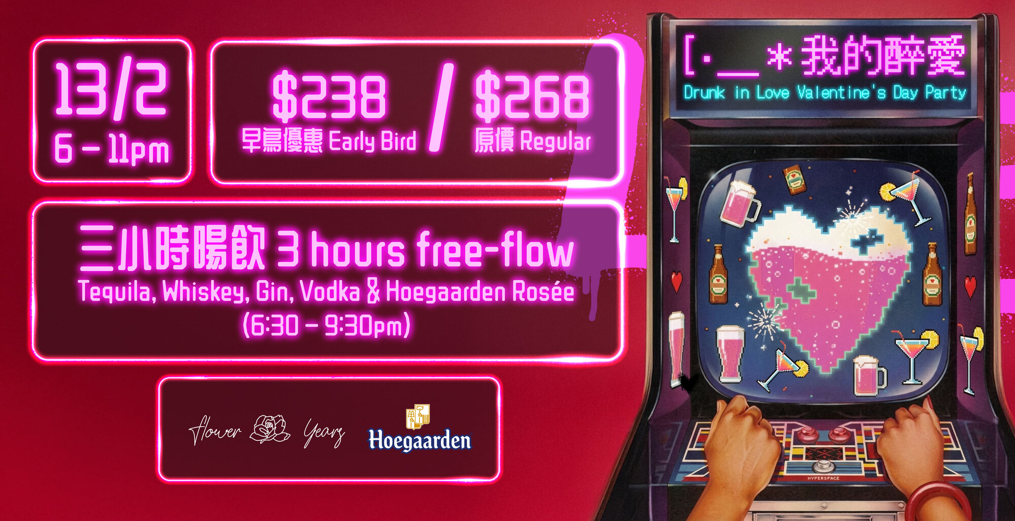 香港逸東酒店 Eaton HK 旗下酒吧「花樣年華」就準備好一場夠醉、夠浪漫、又夠氣氛嘅 「我的醉愛」情人節派對。派對將於 2026 年 2 月 13 日(星期五) 舉行,由黃昏玩到夜晚,一次過集齊任飲、音樂、美食同遊戲。當晚入場券已包 3 小時指定酒品任飲(晚上 6:30 至 9:30),酒單誠意十足,包括龍舌蘭、威士忌、氈酒、伏特加,以及帶點果香嘅 Hoegaarden Rosée,派對期間會無限供應三款佐酒小食,包括迷你薄餅、南瓜薯餅同焦糖爆谷,鹹甜平衡得剛剛好。現場會有 DJ 打碟助興,播放浪漫又帶點微醺感嘅音樂,令整個空間都充滿情人節氣氛;同場仲會穿插啤酒遊戲,隨時炒熱全場,玩味十足。