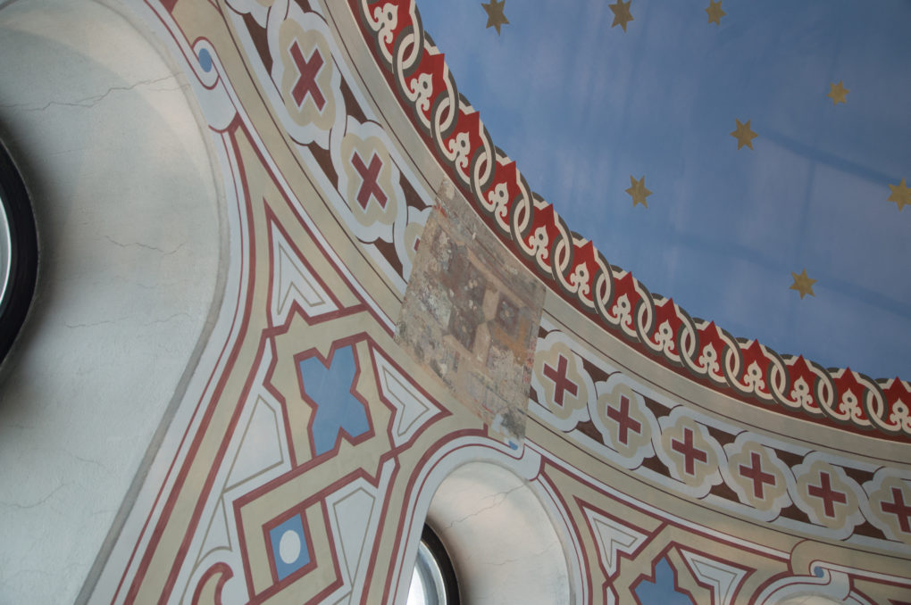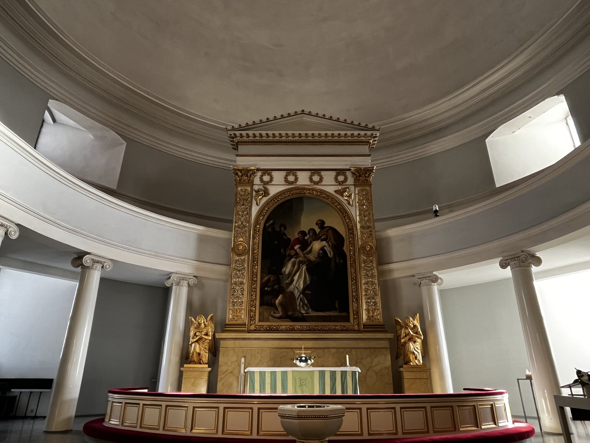 教堂建於 1830 年,最多可容納 1300 人,它的內部不算奢華,都是十分簡潔的設計,以白色為主,中間有一幅耶穌和聖徒在一起的畫像。最特別的是教堂上方有一座弧形的管風琴,雖然體積不大,但是依著圓頂的弧形設計,十分有心思。另外有幾盛金色的吊燈,與白色的教堂襯托,十分顯眼。