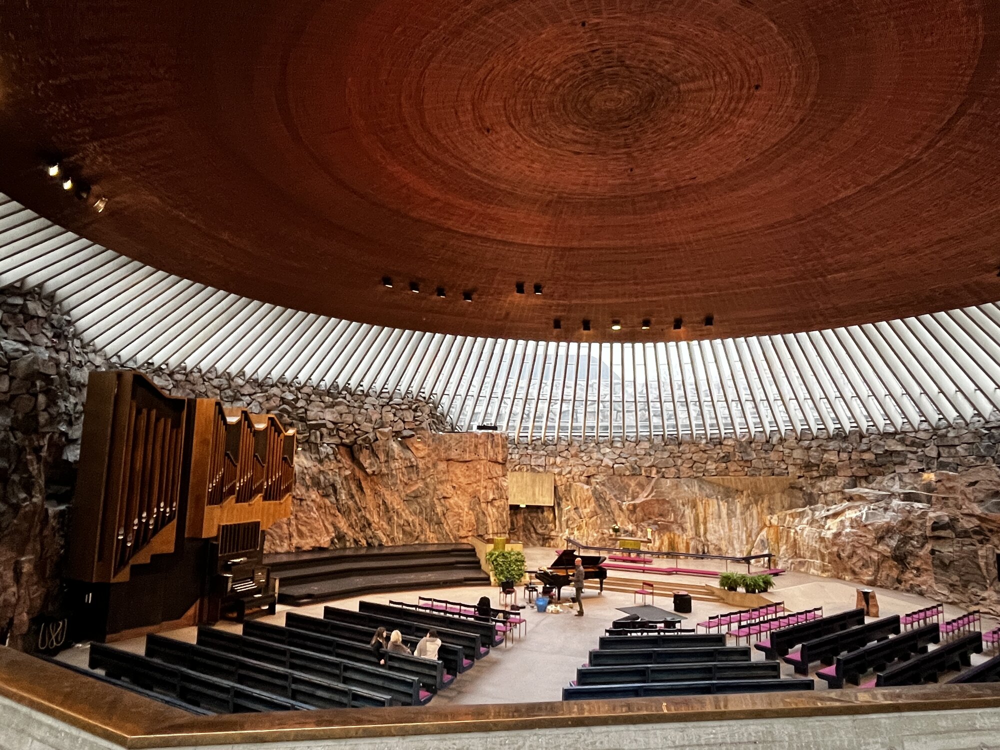 一進入教堂的內部會被它的設計嚇到,由銅造成的巨大圓頂是教堂的天花板,與其他傳統教堂設計完全不同,而且天花板和岩石牆中間用了玻璃來連接,日間會有陽光照射,無論是採光度還是空間感都非常好。使用銅來做天花板據說是因為配合岩石的特性,好讓聲音更好在教堂內環繞,因此這裡也是許多音樂會的表演場地,每年的聖誕節教堂亦會舉辦多場音樂會,聽說真的是會聽出耳油呢!