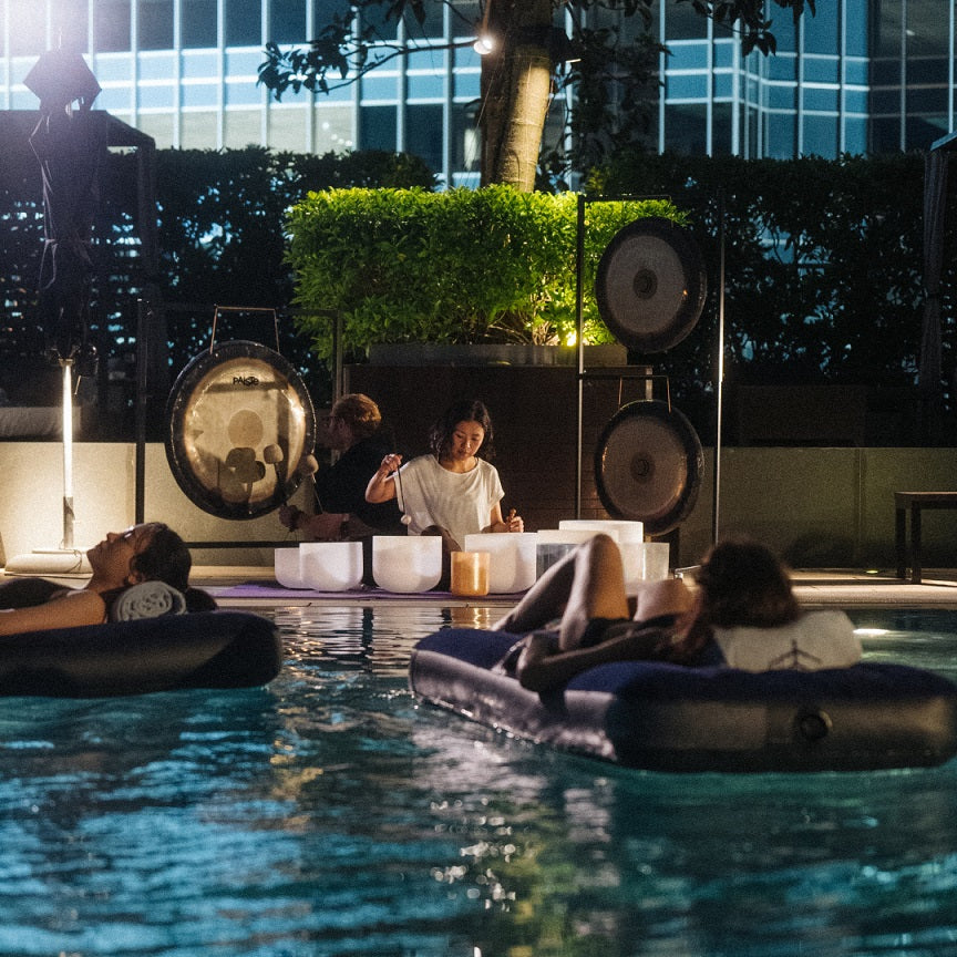 香港富麗敦海洋公園酒店的漂浮頌缽體驗每位收費 HK$980,設兩個時段。第一場於晚上 6 時開始,參加者可先享用水療熱區、游泳池及健身房設施,晚上 7 時於戶外集合參加啟始環節,在海洋及港灣景致前進行呼吸練習與溫和伸展,7 時 30 分在水面輕臥,展開 60 分鐘漂浮頌缽音浴,夕陽西沉之際,城市燈火於泳池旁亮起,整個體驗約於晚上 9 時 30 分結束,並附健康茶點。第二場於晚上 7 時開始,先使用水療及相關設施,晚上 9 時參與面向大海的戶外啟始環節,其後在星空下進行漂浮頌缽體驗,約於晚上 10 時 30 分結束。每場均包括水療熱區設施使用、戶外啟始環節、引導式呼吸練習及溫和伸展、60 分鐘頌缽漂浮音浴、健康滋養餐點,以及迎賓禮包,內含水療優惠券及 3 堂免費瑜伽課。同日於 Lighthouse Cafe 用餐可享尊屬折扣優惠,亦可選擇加訂海景客房。