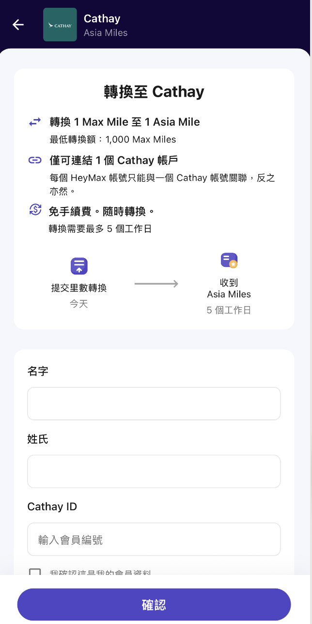 用戶可以將 Max Miles 以一比一比例兌換成 Asia Miles,而最低轉換額為一千 Max Miles。每個 HeyMax 帳號只能連結一個 Cathay 帳號,同樣每個 Cathay 帳號亦只能綁定一個 HeyMax 帳號,以保持兌換記錄一致和安全性。整個兌換過程不設任何手續費,提交申請後最快可於五個工作日內收到 Asia Miles,因此用戶如果準備換機票,可以按照旅行計劃靈活轉換,不需要承受額外費用。提交兌換後,系統會即時處理,而 Asia Miles 最遲會於五個工作日後存入戶口。除了國泰之外,HeyMax 亦支援將 Max Miles 換成 ALL Accor 的 Reward Points,只要提交兌換申請,大部分用戶當天便會收到 Reward Points,非常適合用來換住宿、升等或旅遊相關優惠。