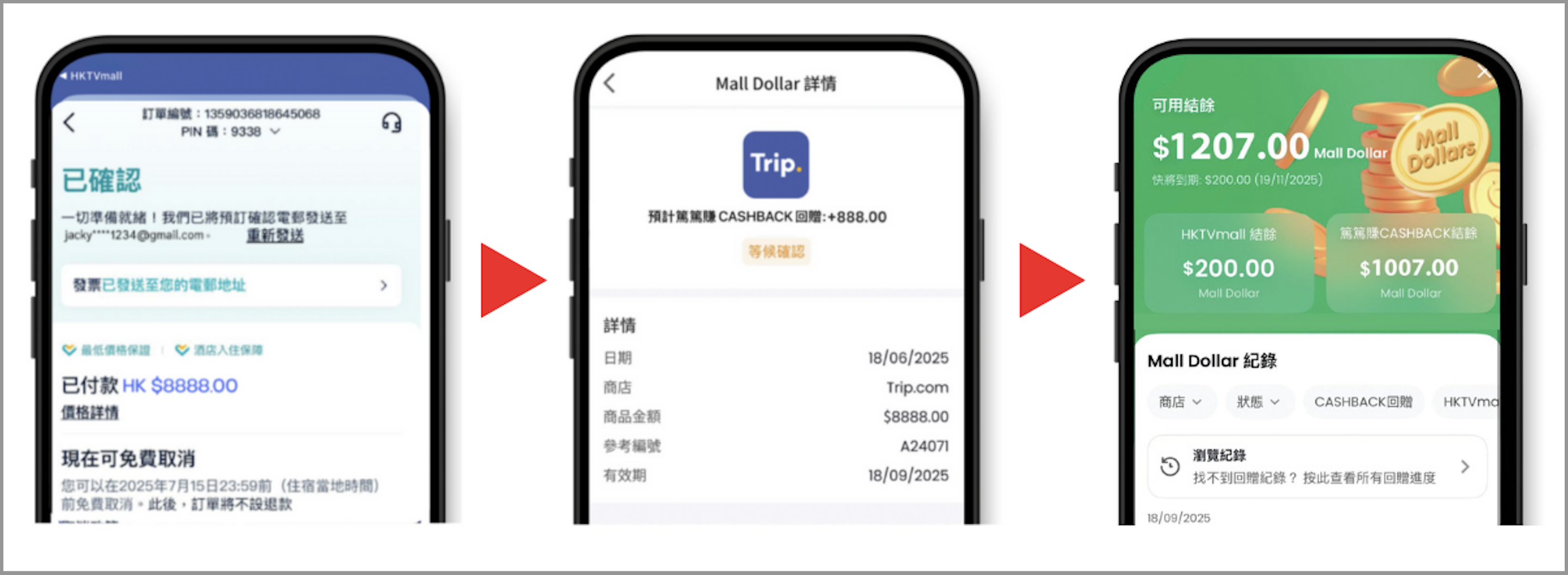 ▼跳轉後正常預訂或購物並完成付款後,返回 HKTVmall「Mall Dollar」頁面即可查看待確認回贈金額。經商戶確認預訂後回贈就會自動發放回贈,1 Mall Dollar = 1 港元!