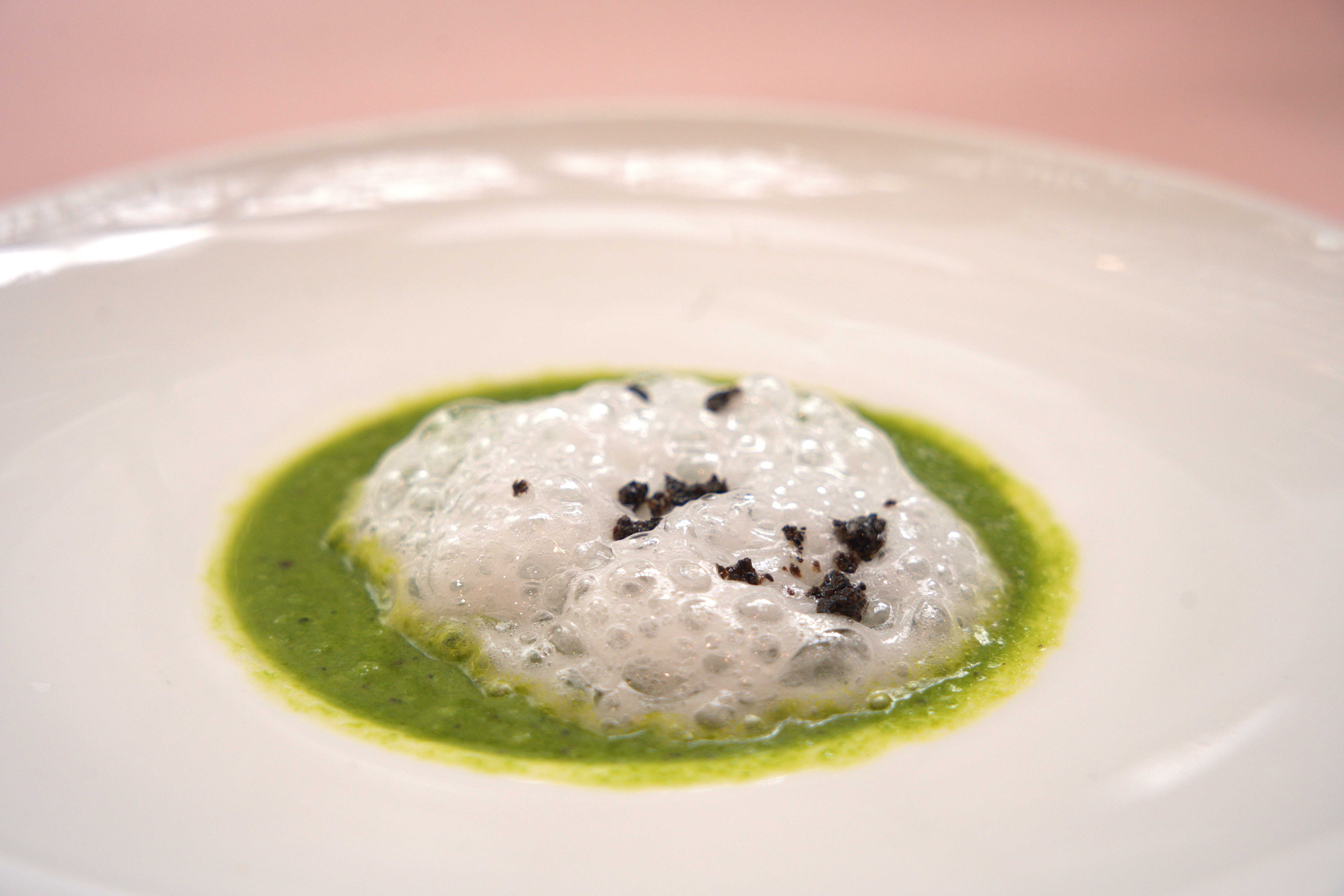 前菜為地中海式龍蝦及海鮮,選用新鮮彈牙的龍蝦及多款海鮮,配以柔滑牛油果醬,並加入茴香酒、法蔥及檸檬莎莎作點綴,酸香清新,層次分明。隨後奉上的黑松露油菠菜湯,口感幼滑細膩,菠菜的清甜與黑松露油的馥郁香氣交織,為整個晚宴帶來溫暖而優雅的過渡。
