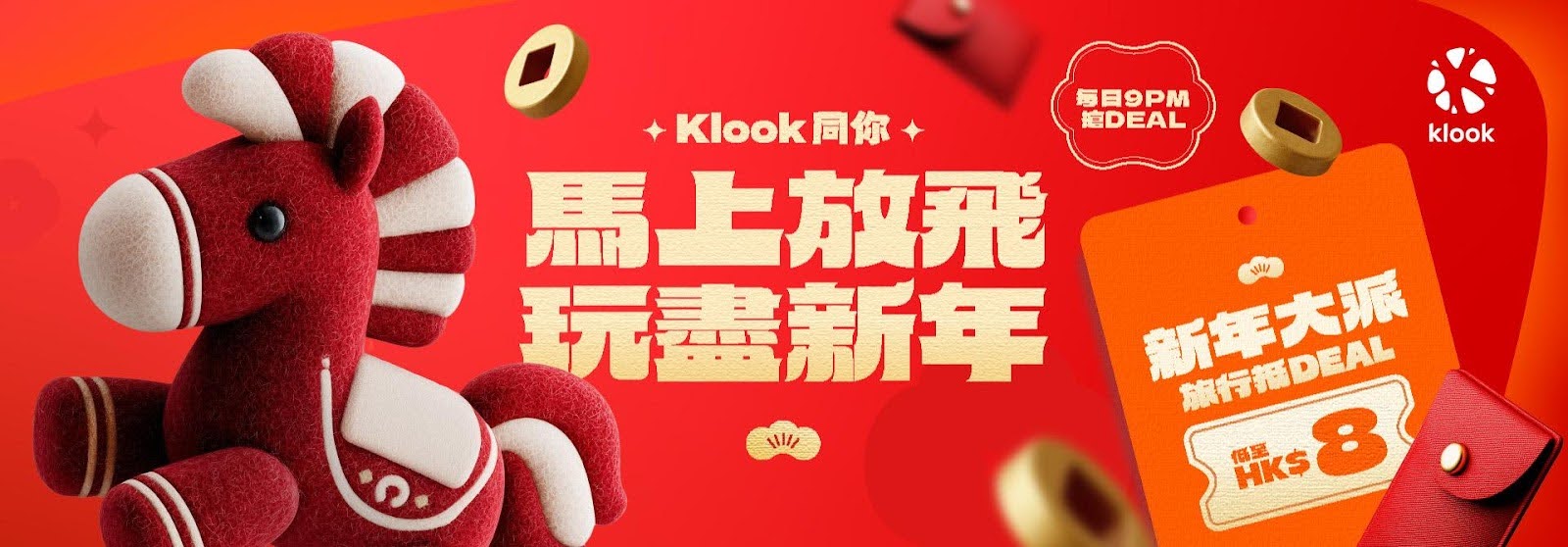 新年就到,Klook 即日起推出「日日旅行大利是」新春優惠,由 1 月 8 日至 2 月 19 日,每日晚上 9 點都有限量「快閃抵Deal」,優惠價低至 HK$8 起!無論你想出走旅行、食自助餐、買賀年糕點、坐機場快綫定留港玩樂,都有抵到爆嘅選擇。