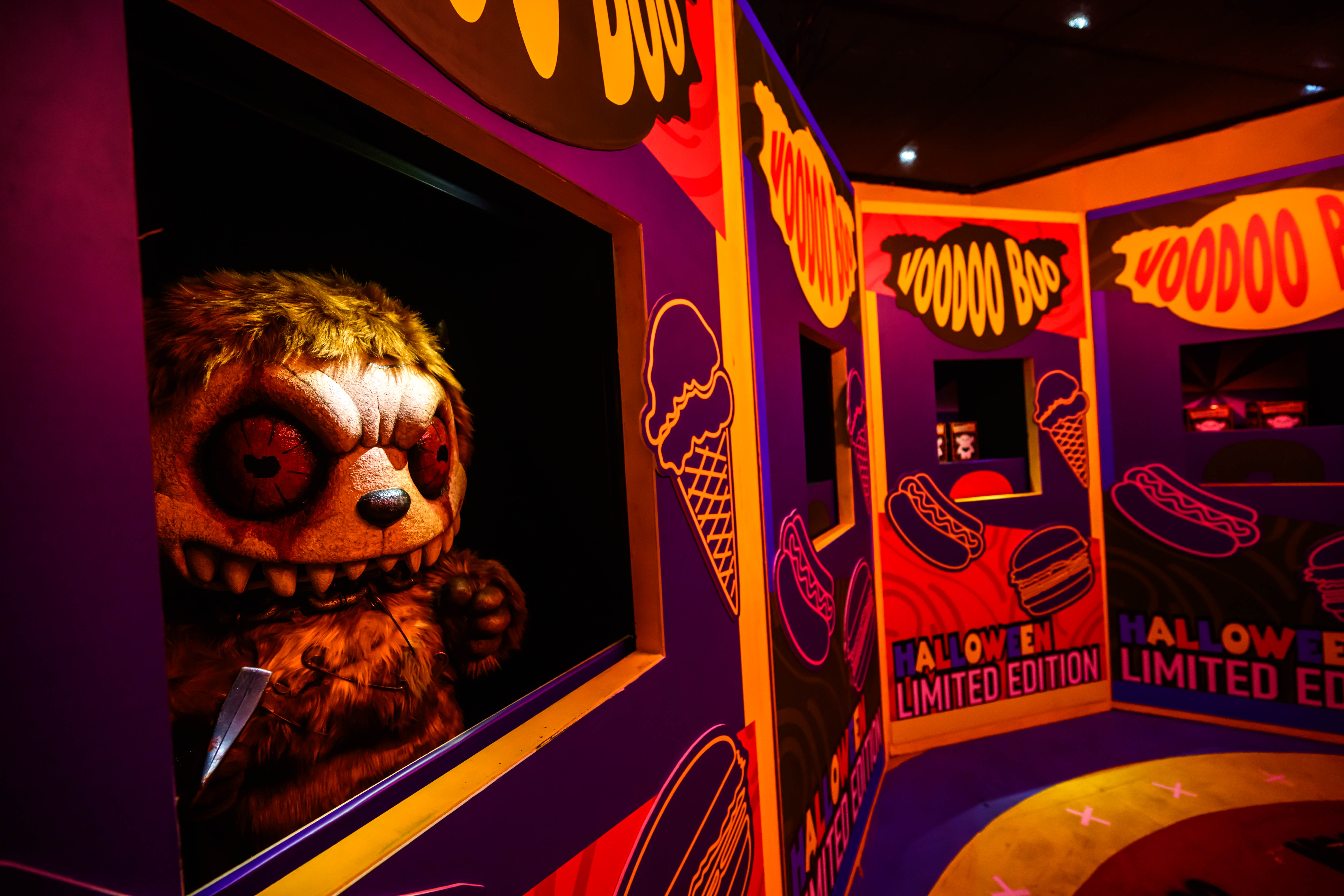 今年的「哈囉喂全園祭」有六大主題鬼屋:「AEON 信用卡呈獻:怨靈盲盒」,棄置的玩具化身頑魂,誓要展開復仇。進場前更要抽取一個盲盒,幸運的話還有機會帶着 Voodoo Boo 公仔一同上路,正式開箱你的童年夢魘。」九龍醺店呈獻:港詭奇案」,遊人將化身神探,搭電梯回到香港歷年最血腥的奇案現場,逐步揭開未能安息的真相。「H25.慄」邀請大家穿上保護衣,參與瘋狂科學家的恐怖實驗,限時挑戰感官極限。山上有「詭宅獻祭」由邪教組織領軍,遊人將參與禁忌儀式,抽到「死神牌」的話更可能觸發未知詛咒;「喰人之森」,倖存者將誤入食人族部落,沿路遍佈殘骸與詭異圖騰,恐怖氛圍直逼極限。最後,「噬魂墓地」以墨西哥亡靈節為主題,在花圈與祭典的繽紛氛圍下,遊人隨時墮入恐怖深淵。