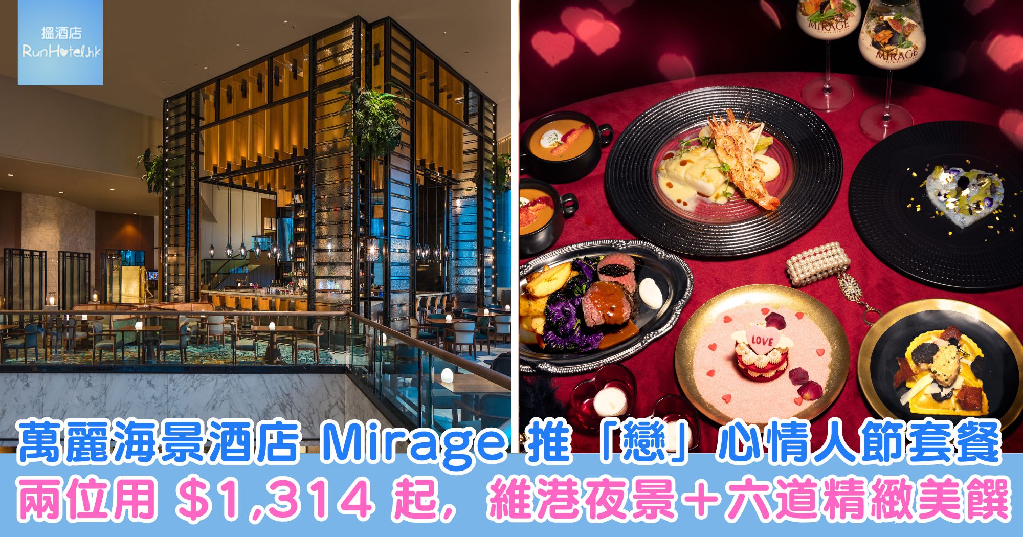 香港萬麗海景酒店 Mirage Bar & Restaurant 將於 2026 年 2 月 13 日至 15 日推出「臻味『戀』心情人節晚聚」六道菜套餐,網上商店預訂優惠價兩位用 HK$ 1,314(已連服務費)、一位用 HK$ 688