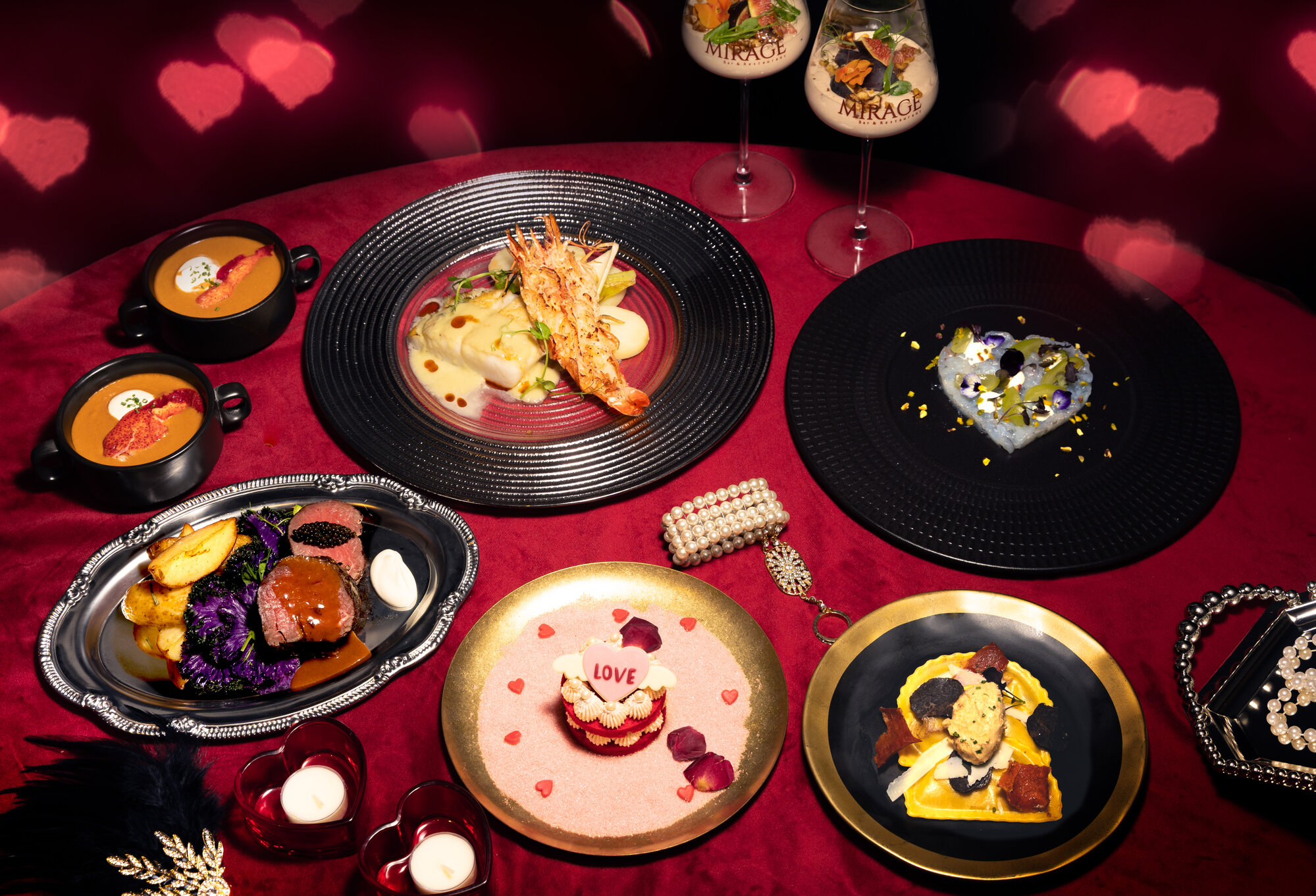 香港萬麗海景酒店 Mirage Bar & Restaurant 將於 2026 年 2 月 13 日至 15 日推出「臻味『戀』心情人節晚聚」六道菜套餐,網上商店預訂優惠價兩位用 HK$ 1,314(已連服務費)、一位用 HK$ 688
