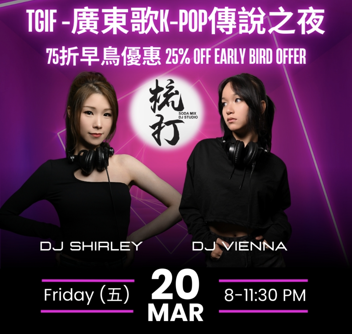 ▼當晚將邀請人氣 DJ 組合 Shirley 與 Vienna 現場演出,帶來經典廣東歌並融合動感 K-Pop 元素,讓參加者一邊享用飲品,一邊沉浸於節奏與旋律交織的派對氣氛之中。活動主打黃金年代廣東歌與韓流節奏結合的音樂體驗,適合喜歡流行音樂及週末夜生活的市民與朋友一同參與,於星期五晚上感受派對氛圍。