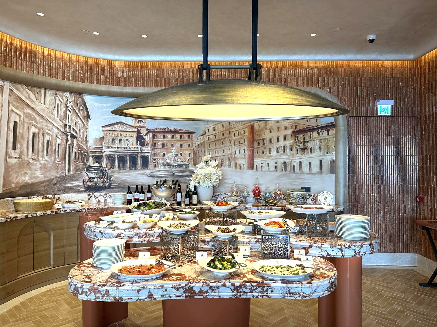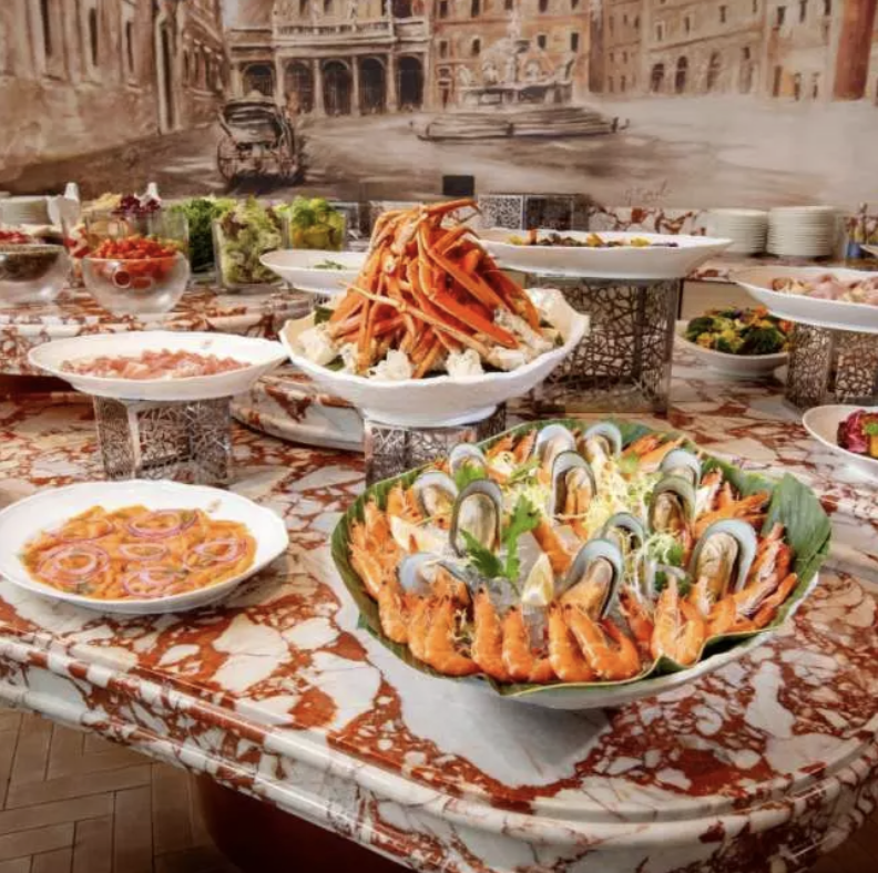 首先是 Antipasti 前菜區,冰鎮海鮮陣容包括波士頓龍蝦、雪場蟹腳,配上煙燻三文魚、帕爾瑪火腿配蜜瓜、水牛芝士與番茄沙律等經典組合。想要升級享受的話,可加配「Sabatini魚子醬(10克)」或「慢煮蛋配阿爾巴白松露(另加$588)」,香氣撲鼻、濃郁奢華。現場即煮區(Live Station)同樣令人期待,有黑松露炒蛋多士、意大利生牛肉他他及是日餐湯,新鮮即製的香氣瞬間喚醒週末食慾。主廚團隊以傳統手法演繹多款 Pasta 及 Risotto,例如蘑菇意大利飯配香梨、藏紅花意大利飯配牛仔肉汁 或 是日意粉,每一口都嚐到濃郁而層次分明的義式靈魂。主菜部分同樣精彩,選項包括:香烤澳洲羊架配香草醬、香煎牙魚配檸檬汁及時令蔬菜,以及牛仔柳配羊肚菌、白甘筍蓉及阿爾巴白松露(另加$688)。最後當然少不了甜品桌 Dessert Table,多款意式甜點如提拉米蘇、焦糖布甸、芝士蛋糕等任你挑選。Menu 不定期會更改,詳情可按此。