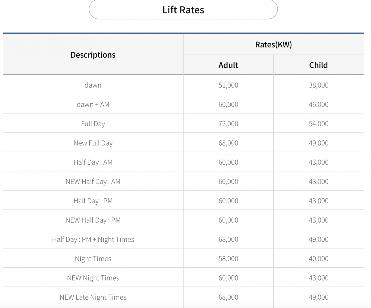 價錢方面,門票價錢可以細分為日間、晚上、中午+晚上多個搭配,如果只玩幾個小時的話,可以挑選下午 13:00-17:00,價錢為 ₩63,000。詳細價錢可以參閱下表。另外還有滑雪用品租借服務,下午 13:00-17:00 價錢為 ₩28,000,另外想乘搭纜車的話,也是不包在門票內的,一次價錢為 ₩15,000。