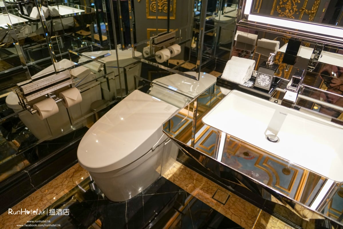 最後帶大家看看他們的「羅馬浴室」,浴室雙洗水盤,乾濕分離,浴缸稍嫌細了一點。而且整體環境個人認為有點黑暗(這是羅馬浴室的設計嗎?!),雖是豪華,但個人還是喜歡用白色或灰色的大理石設計的浴室。(例如之前住過珠海St.regis,就覺得那個浴室舒服好多)