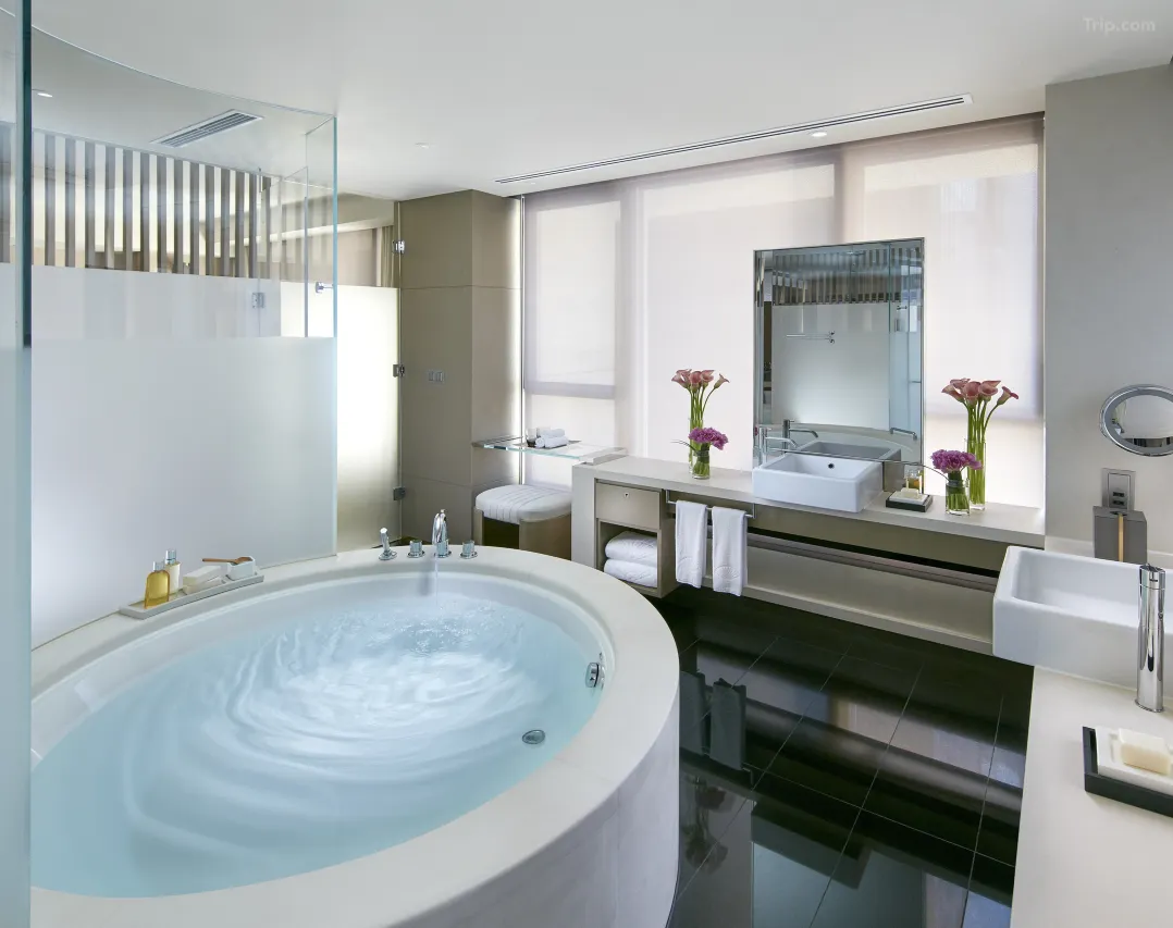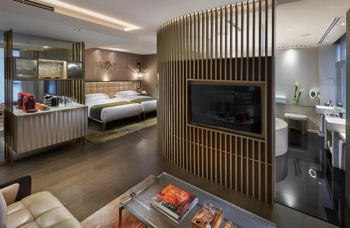 酒店合共 109 間客房及套房亦全面翻新,最基本的 L450 客房面積約 42 平方米,採用木地板、絲綢牆飾及訂製地毯;L600 客房則保留標誌性的弧形玻璃浴室及 7 呎圓形浴缸,並升級至 530 針床品。面積達 167 平方米的娛樂套房配備影音牆、 Gaggenau 廚房及智能恆溫睡眠系統,主打高端住宿及聚會需求。