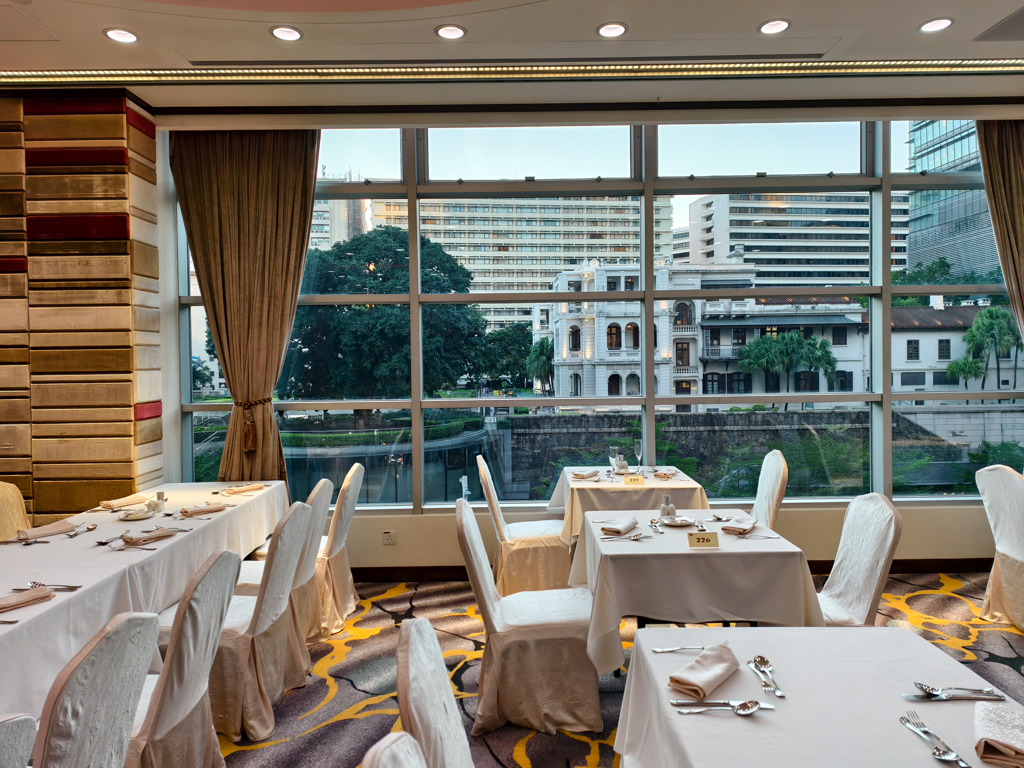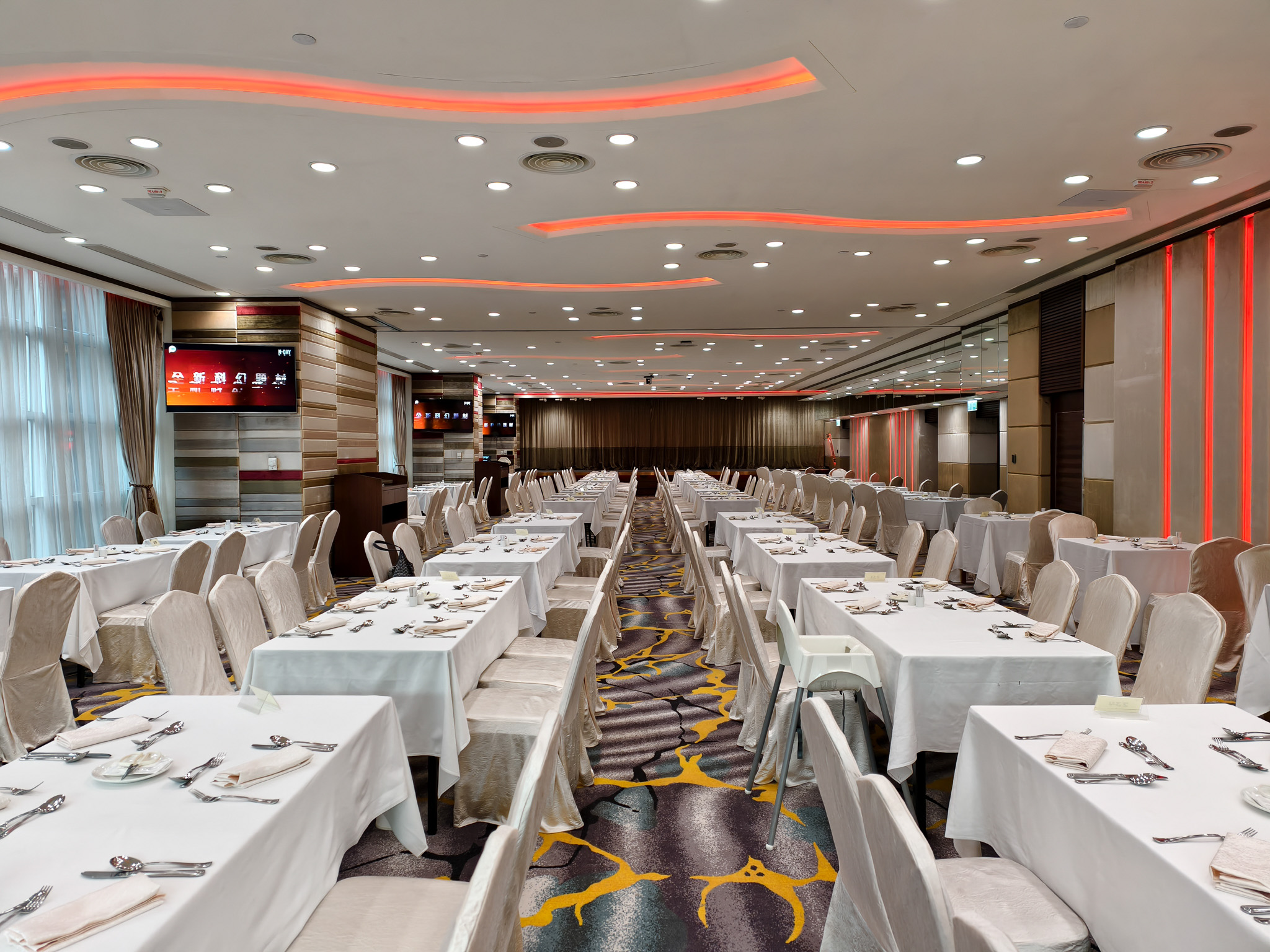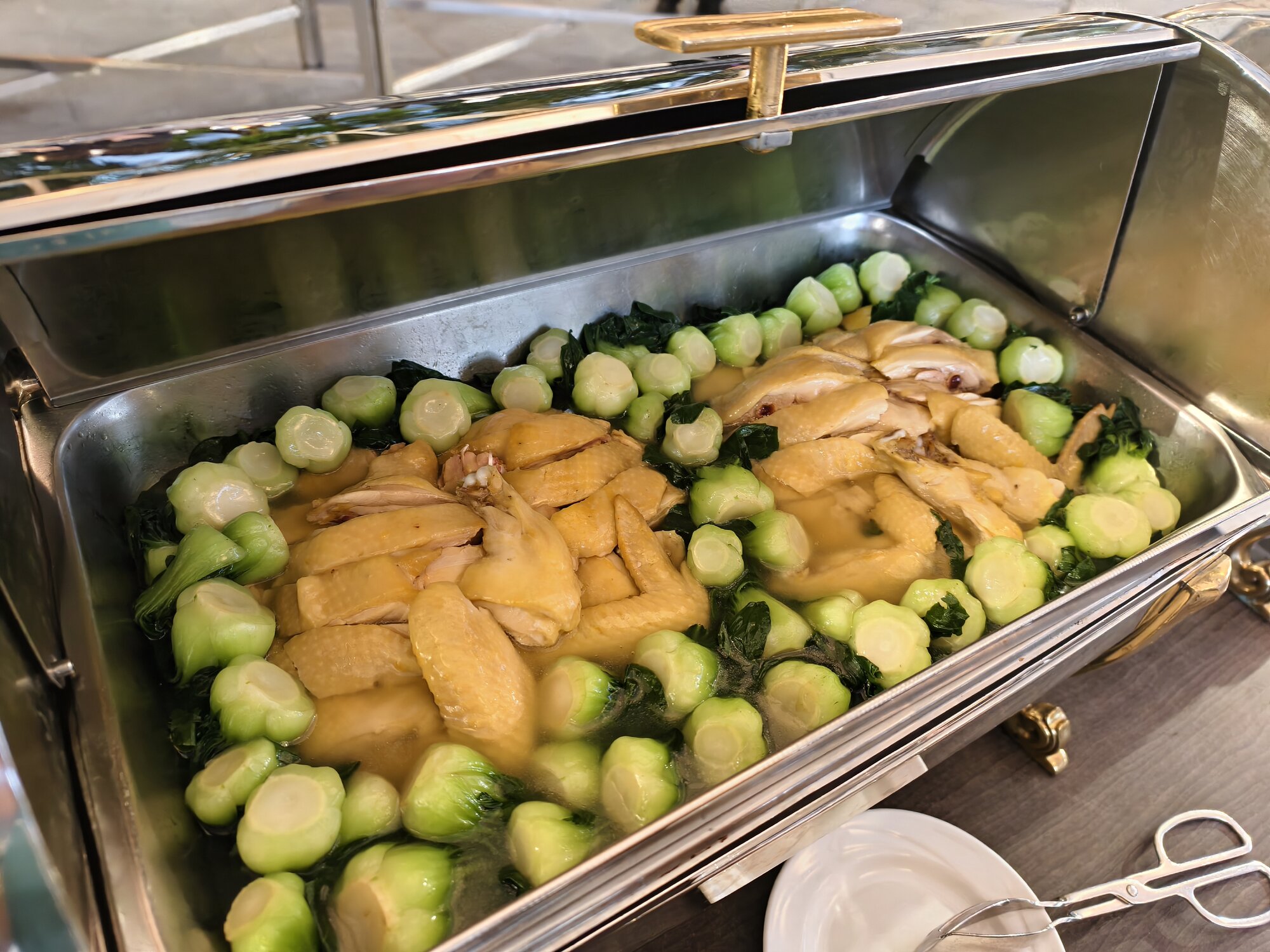 ▼BBQ 自助餐喺四樓平台舉行,我哋就安排咗坐宴會廳,座位排得整齊,用白色椅套再加大片玻璃窗,感覺乾淨又優雅。窗外望到一棟棟舊樓同綠樹,環境好舒服。